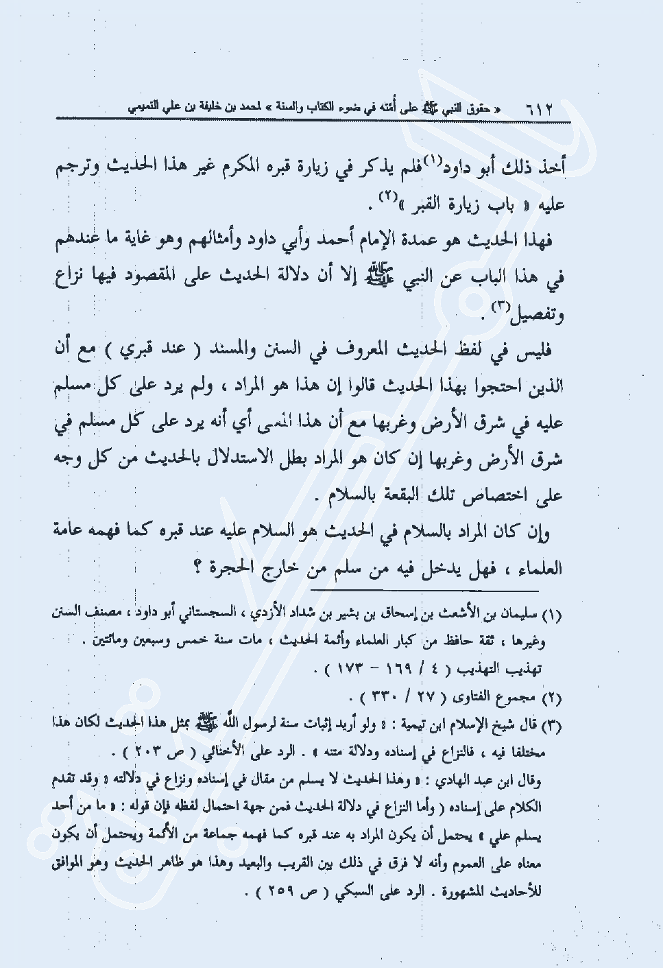 فهذا الحديث هو عمدة الإمام أحمد وأبي داود وأمثالهم وهو غاية ما عندهم في هذا الباب عن النبي صلى الله عليه وسلم إلا أن دلالة الحديث على المقصود فيها نزاع وتفصيل3.فليس في لفظ الحديث المعروف في السنن والمسند (عند قبري) مع أن الذين احتجوا بهذا الديث قالوا إن هذا هو المراد، ولم يرد على كل مسلم عليه في شرق الأرض وغربها مع أن المعنى أي أنه يرد على كل مسلم في شرق الأرض وغربها إن كان هو المراد بطل الاستدلال بالحديث من كل وجه على اختصاص تلك البقعة بالسلام.