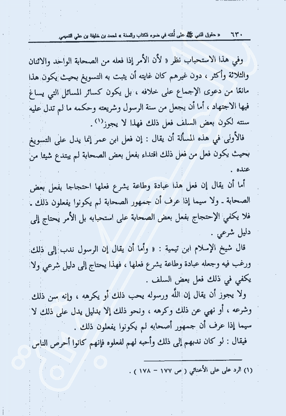 وفي هذا الاستحباب نظر "لأن الأمر إذا فعله من الصحابة الواحد والاثنان والثلاثة وأكثر، دون غيرهم كان غايته أن يثبت به التسويغ بحيث يكون هذا مانعا من دعوى الإجماع على خلافه، بل يكون كسائر المسائل التي يساغ فيها الاجتهاد، أما أن يجعل من سنة الرسول وشريعته وحكمه ما لم تدل عليه سنته لكون بعض السلف فعل ذلك فهذا لا يجوز1.