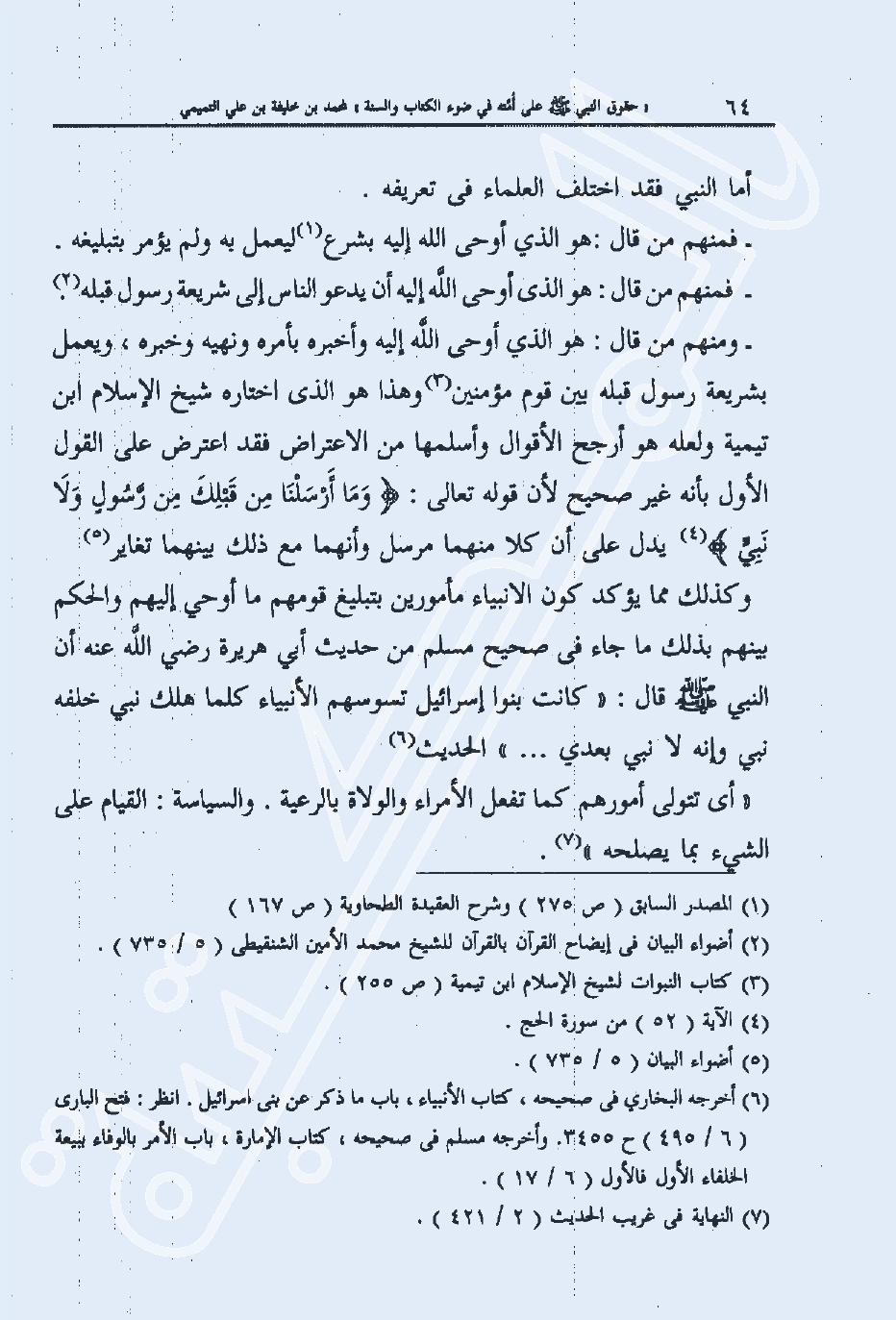 - ومنهم من قال: هو الذي أوحى الله إليه وأخبره بأمره ونهيه وخبره، ويعمل بشريعة رسول قبله بين قوم مؤمنين3 وهذا هو الذي اختاره شيخ الإسلام ابن تيمية ولعله هو أرجح الأقوال وأسلمها من الاعتراض فقد اعترض على القول الأول بأنه غير صحيح لأن قوله تعالى: {وَمَا أَرْسَلْنَا مِنْ قَبْلِكَ مِنْ رَسُولٍ وَلا نَبِيٍّ} 4 يدل على أن كلا منهما مرسل وأنهما مع ذلك بينهما تغاير5 وكذلك مما يؤكد كون الأنبياء مأمورين بتبليغ قومهم ما أوحي إليهم والحكم بينهم بذلك ما جاء في صحيح مسلم من حديث أبي هريرة رضي الله عنه أن النبي صلى الله عليه وسلم قال: "كانت بنوا إسرائيل تسوسهم الأنبياء كلما هلك نبي خلفه نبي وإنه لا نبي بعدي ... " الحديث6.