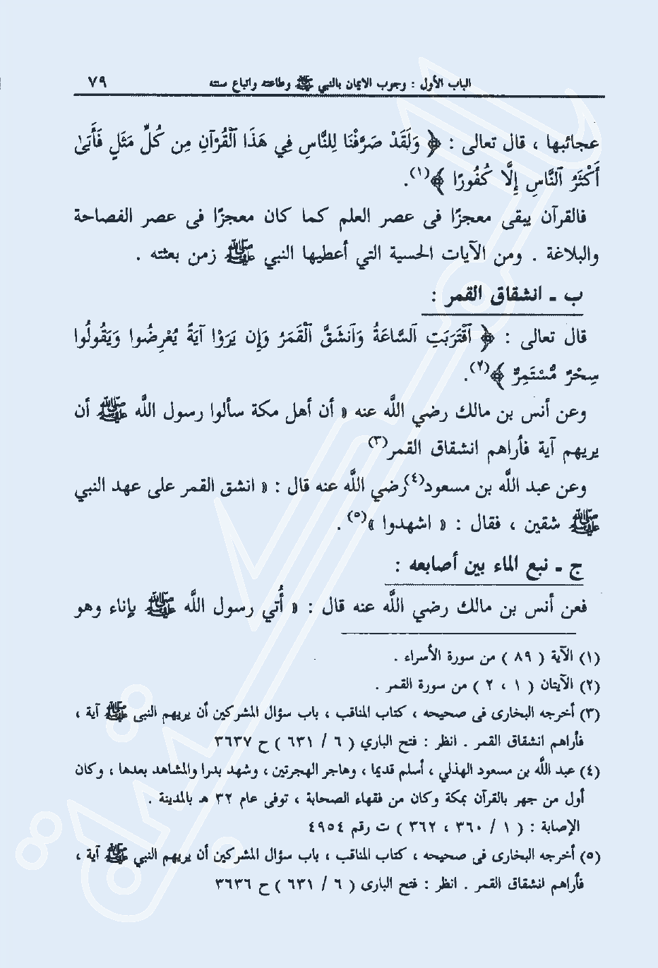 5 أخرجه البخاري في صحيحه، كتاب المناقب: باب سؤال المشركين أن يريهم النبي صلى الله عليه وسلم آية، فأراهم انشقاق القمر. انظر: فتح الباري (6/ 631) ح 3636.