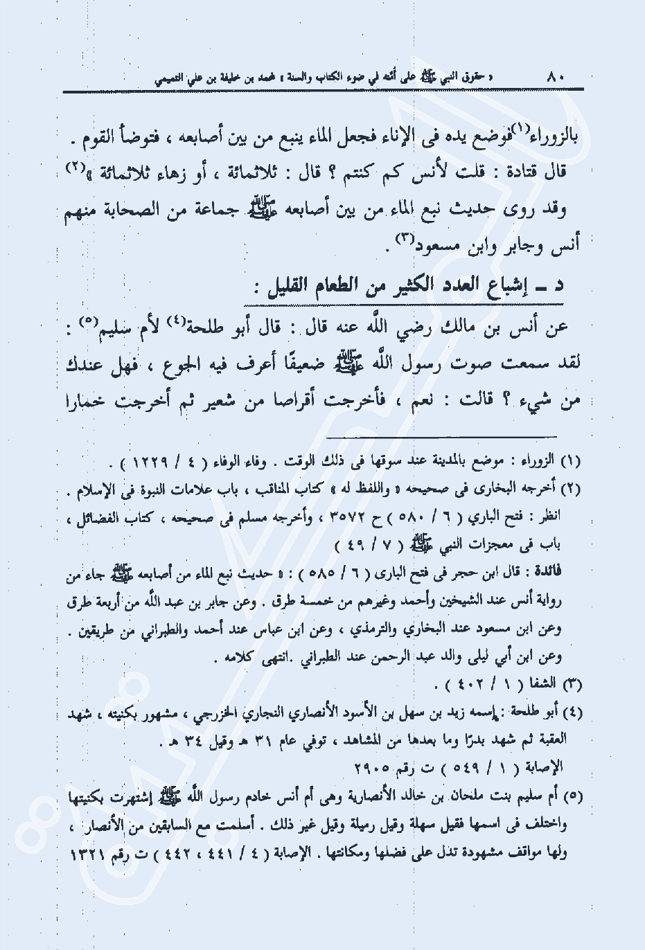 بالزوراء1 فوضع يده في الإناء فجعل الماء ينبع من بين أصابعه، فتوضأ القوم. قال قتادة: قلت لأنس كم كنتم؟، قال: ثلائمائة، أو زهاء ثلاثمائة"2 وقد روى حديث نبع الماء من بين أصابعه صلى الله عليه وسلم جماعة من الصحابة منهم أنس وجابر وابن مسعود3.