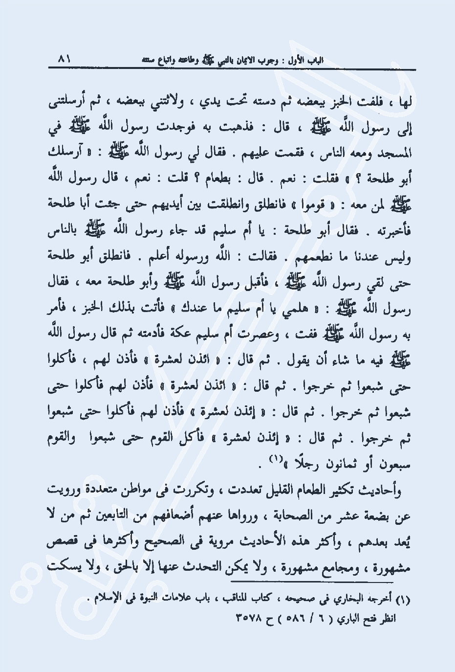 1 أخرجه البخاري في صحيحه، كتاب المناقب: باب، علامات النبوة في الإسلام. انظر فتح الباري (6/ 586) ح 3578.