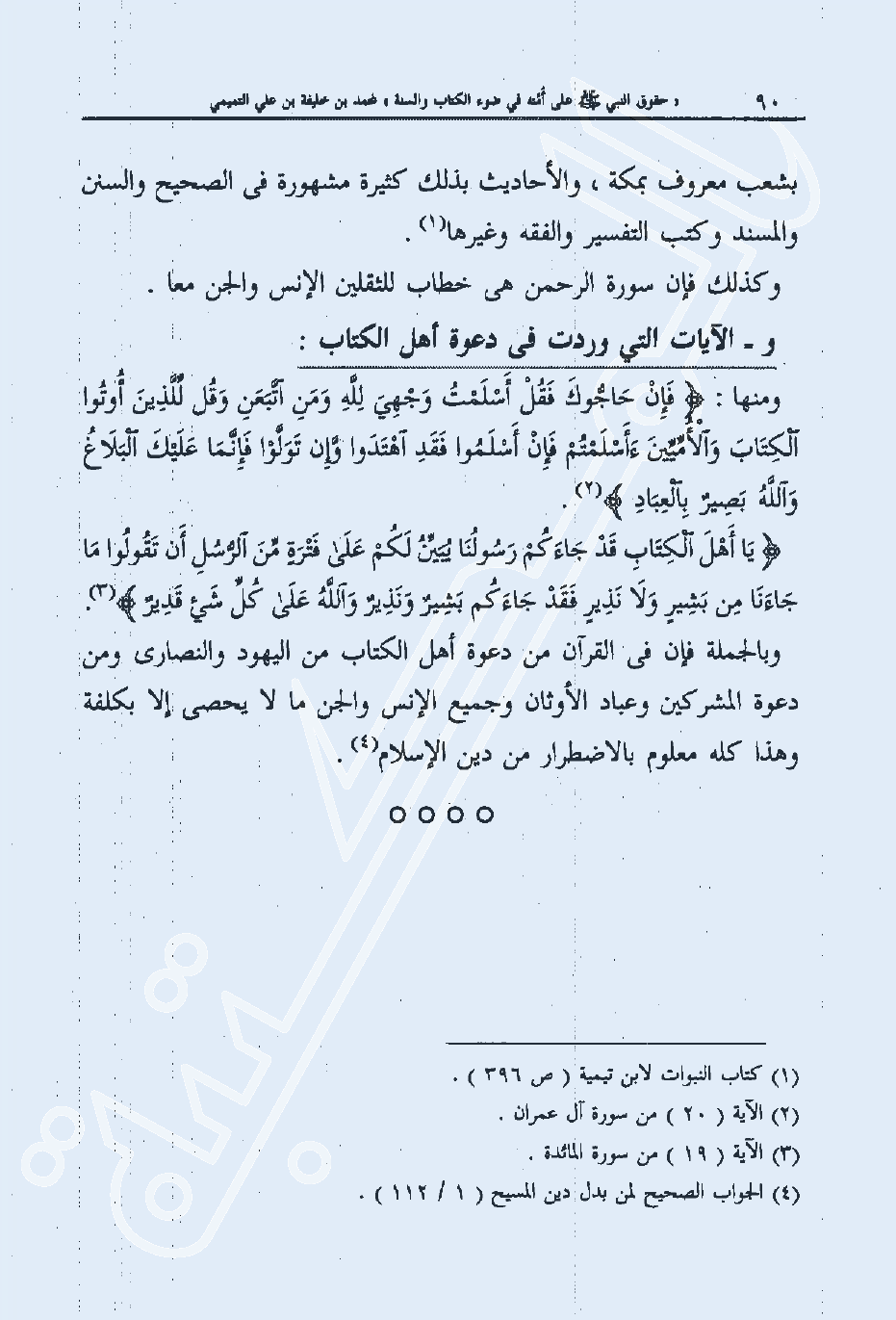 ومنها: {فَإِنْ حَاجُّوكَ فَقُلْ أَسْلَمْتُ وَجْهِيَ لِلَّهِ وَمَنِ اتَّبَعَنِ وَقُلْ لِلَّذِينَ أُوتُوا الْكِتَابَ وَالْأُمِّيِّينَ أَأَسْلَمْتُمْ فَإِنْ أَسْلَمُوا فَقَدِ اهْتَدَوْا وَإِنْ تَوَلَّوْا فَإِنَّمَا عَلَيْكَ الْبَلاغُ وَاللَّهُ بَصِيرٌ بِالْعِبَادِ} 2.