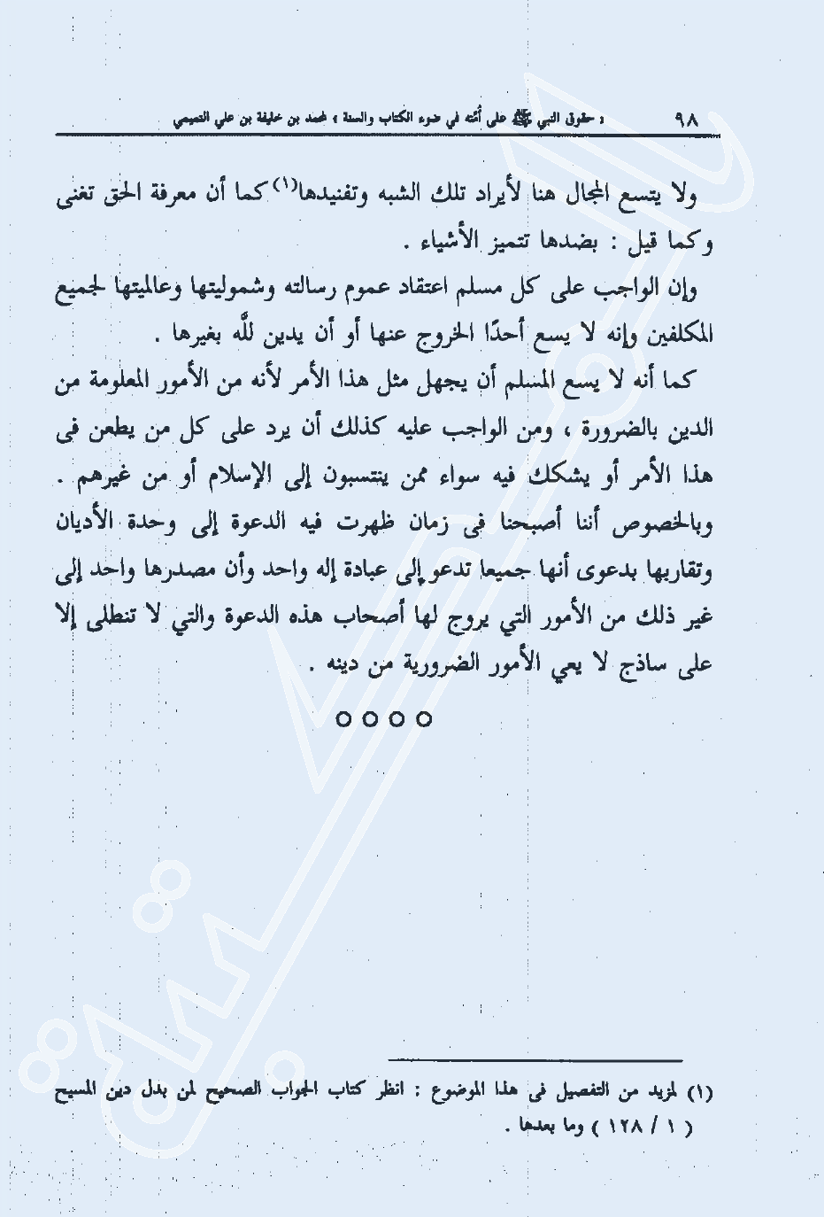 كما أنه لا يسع المسلم أن يجهل مثل هذا الأمر لأنه من الأمور المعلومة من الدين بالضرورة، ومن الواجب عليه كذلك أن يرد على كل من يطعن في هذا الأمر أو يشكك فيه سواء ممن ينتسبون إلى الإسلام أو من غيرهم، وبالخصوص أننا أصبحنا في زمان ظهرت فيه الدعوة إلى وحدة الأديان وتقاربها بدعوى أنها جميعا تدعو إلى عبادة إله واحد وأن مصدرها واحد إلى غير ذلك من الأمور التي يروج لها أصحاب هذه الدعوة والتي لا تنطلي إلا على ساذج لا يعي الأمور الضرورية من دينه.