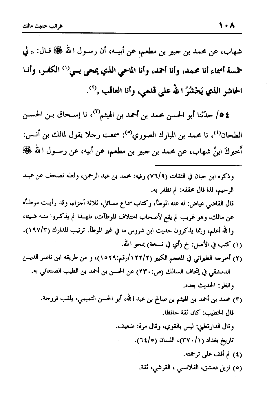54 - حَدَّثَنَا أَبُو الْحَسَنِ مُحَمَّدُ بْنُ أَحْمَدَ بْنِ الْهَيْثَمِ، نا إِسْحَاقُ بْنُ الْحَسَنِ الطَّحَّانُ، نا مُحَمَّدٌ الْمُبَارَكُ الصُّورِيُّ، سَمِعْتُ رَجُلًا، يَقُولُ لِمَالِكِ بْنِ أَنَسٍ: أَخْبَرَكَ ابْنُ شِهَابٍ، عَنْ مُحَمَّدِ بْنِ جُبَيْرِ بْنِ مُطْعِمٍ، عَنْ أَبِيهِ، عَنْ رَسُولِ اللَّهِ صَلَّى اللَّهُ عَلَيْهِ وَسَلَّمَ -[109]- قَالَ: «لِي خَمْسَةُ أَسْمَاءٍ , أَنَا مُحَمَّدٌ، وَأَنَا أَحْمَدُ، وَأَنَا الْمَاحِي، وَأَنَا الْحَاشِرُ، وَأَنَا الْعَاقِبُ»