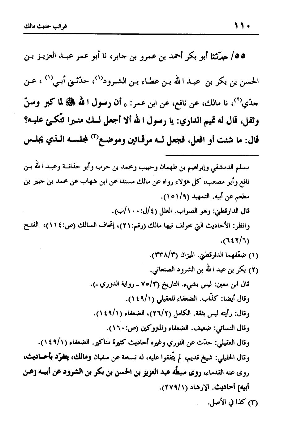 55 - حَدَّثَنَا أَبُو بَكْرٍ أَحْمَدُ بْنُ عَمْرِو بْنِ جَابِرٍ، نا أَبُو عُمَرَ عَبْدُ الْعَزِيزِ بْنُ الْحَسَنِ بْنِ بَكْرِ بْنِ عَبْدِ اللَّهِ بْنِ عَطَاءِ بْنِ الشَّرُودِ،: حَدَّثَنِي أَبِي، عَنْ جَدِّي، نا مَالِكٌ، عَنْ نَافِعٍ، عَنِ ابْنِ عُمَرَ، أَنَّ رَسُولَ اللَّهِ صَلَّى اللَّهُ عَلَيْهِ وَسَلَّمَ لَمَّا كَبُرَ وَسَنَّ وَثَقُلَ قَالَ لَهُ تَمِيمٌ الدَّارِيُّ: يَا رَسُولَ اللَّهِ، أَلَا أَجْعَلُ لَكَ مِنْبَرًا أَتَّكِئُ عَلَيْهِ مَا شِئْتَ أَوْ أَفْعَلُ. فَجَعَلَ لَهُ مِرْقَاتَهُ بِمَوْضِعٍ لِمَجْلِسِهِ الَّذِي يَجْلِسُ -[111]- عَلَيْهِ. فَلَمَّا صَعِدَ النَّبِيُّ صَلَّى اللَّهُ عَلَيْهِ وَسَلَّمَ، وَكَانَ قَبْلَ ذَلِكَ يَسْتَنِدُ إِلَى جِذْعٍ مِنْ سَوَارِي الْمَسْجِدِ، وَكَانَتِ السَّوَارِي مِنْ جُذُوعِ السَّعَفِ مِنْ جَرِيدٍ، فَصَرَخَتِ السَّارِيَةُ صَرْخَتَيْنِ شَدِيدَتَيْنِ حَتَّى سَمِعَهَا النَّاسُ. فَنَزَلَ عِنْدَ ذَلِكَ رَسُولُ اللَّهِ صَلَّى اللَّهُ عَلَيْهِ وَسَلَّمَ فَالْتَزَمَهَا، وَقَالَ لَهَا شَيْئًا مَا يُدْرَى مَا هُوَ فَسَكَنَتْ "
