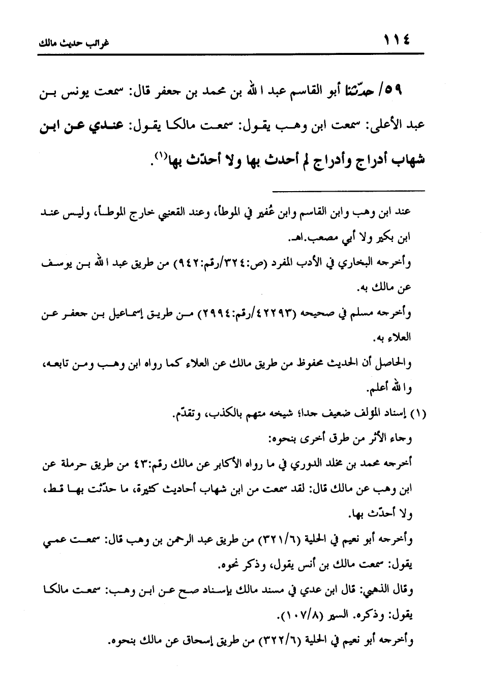 59 - حَدَّثَنَا أَبُو الْقَاسِمِ عَبْدُ اللَّهِ بْنُ مُحَمَّدِ بْنِ جَعْفَرٍ، قَالَ: سَمِعْتُ يُونُسَ بْنَ عَبْدِ الْأَعْلَى، سَمِعْتُ ابْنَ وَهْبٍ، يَقُولُ: سَمِعْتُ مَالِكًا يَقُولُ: «عِنْدِي عَنِ ابْنِ شِهَابٍ أَدْرَاجٌ وَأَدْرَاجٌ لَمْ أُحَدِّثْ بِهَا وَلَا أُحَدِّثُ بِهَا»