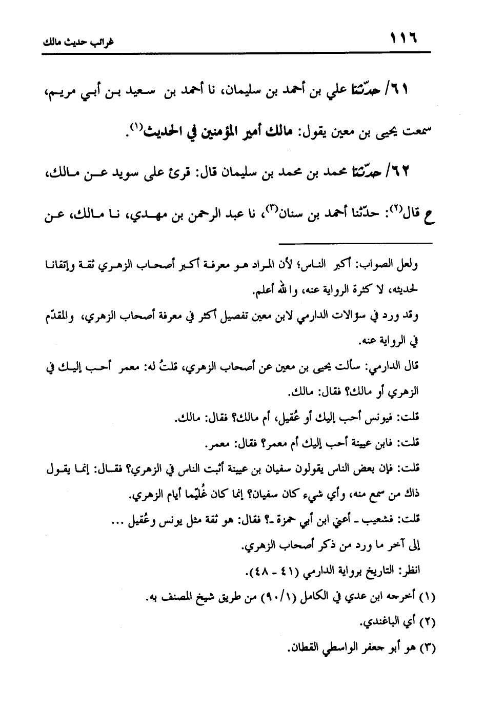 61 - حَدَّثَنَا عَلِيُّ بْنُ أَحْمَدَ بْنِ سُلَيْمَانَ، نا أَحْمَدُ بْنُ سَعِيدِ بْنِ أَبِي مَرْيَمَ، سَمِعْتُ يَحْيَى بْنَ مَعِينٍ، يَقُولُ: «مَالِكٌ أَمِيرُ الْمُؤْمِنِينَ فِي الْحَدِيثِ»