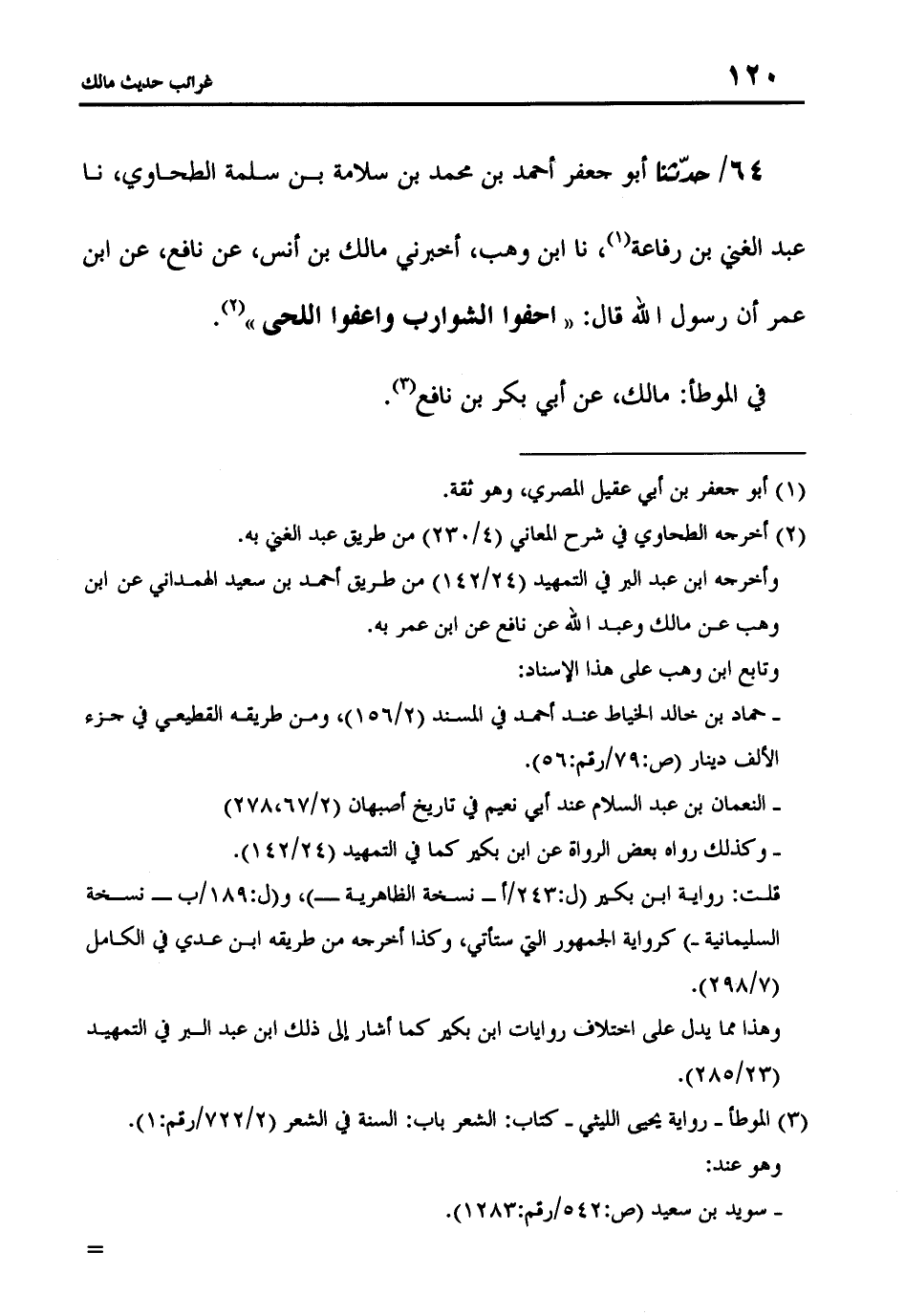 64 - حَدَّثَنَا أَبُو جَعْفَرٍ أَحْمَدُ بْنُ مُحَمَّدِ بْنِ سَلَمَةَ بْنِ سَلَامَةَ الطَّحَاوِيُّ، ثنا عَبْدُ الْغَنِيِّ بْنُ رِفَاعَةَ، نا ابْنُ وَهْبٍ، أَخْبَرَنِي مَالِكُ بْنُ أَنَسٍ، عَنْ نَافِعٍ، عَنِ ابْنِ عُمَرَ،: أَنَّ رَسُولَ اللَّهِ صَلَّى اللَّهُ عَلَيْهِ وَسَلَّمَ قَالَ: «أَحِفُّوا الشَّوَارِبَ وَأَعْفُوا اللِّحَى»