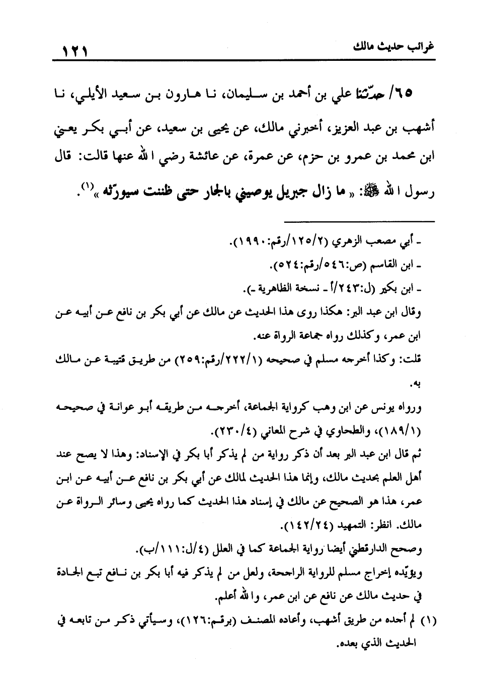 65 - حَدَّثَنَا عَلِيُّ بْنُ أَحْمَدَ بْنِ سُلَيْمَانَ، نا هَارُونُ بْنُ سَعِيدٍ الْأَيْلِيُّ، نا أَشْهَبُ بْنُ عَبْدِ الْعَزِيزِ، أَخْبَرَنِي مَالِكٌ، عَنْ يَحْيَى بْنِ سَعِيدٍ، عَنْ أَبِي بَكْرٍ - يَعْنِي ابْنَ مُحَمَّدِ بْنِ عَمْرِو بْنِ حَزْمٍ، عَنْ عَمْرَةَ، عَنْ عَائِشَةَ، رَضِيَ اللَّهُ عَنْهَا قَالَتْ: قَالَ رَسُولُ اللَّهِ صَلَّى اللَّهُ عَلَيْهِ وَسَلَّمَ: «مَا زَالَ جِبْرِيلُ يُوصِينِي بِالْجَارِ حَتَّى ظَنَنْتُ سَيُوَرِّثُهُ»