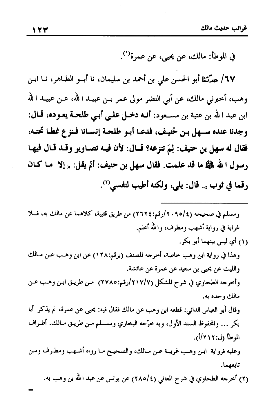 67 - حَدَّثَنَا أَبُو الْحَسَنِ عَلِيُّ بْنُ أَحْمَدَ بْنِ سُلَيْمَانَ، نا أَبُو الطَّاهِرِ، نا ابْنُ وَهْبٍ، عَنْ أَبِي النَّضْرِ، مَوْلَى عُمَرَ بْنِ عُبَيْدِ اللَّهِ، عَنْ عُبَيْدِ اللَّهِ بْنِ عُتْبَةَ بْنِ مَسْعُودٍ،: دَخَلَ عَلَى طَلْحَةَ يَعُودُهُ قَالَ: وَجَدْنَا عِنْدَهُ سَهْلَ بْنَ حُنَيْفٍ , فَدَعَا أَبُو طَلْحَةَ إِنْسَانًا فَنَزَعَ نَمَطًا تَحْتَهُ فَقَالَ لَهُ سَهْلُ بْنُ حُنَيْفٍ: لِمَ تَنْزِعُهُ؟ قَالَ: لِأَنَّ فِيهِ تَصَاوِيرَ , وَقَدْ قَالَ فِيهَا رَسُولُ اللَّهِ صَلَّى اللَّهُ عَلَيْهِ وَسَلَّمَ مَا قَدْ عَلِمْتَ. فَقَالَ سَهْلُ بْنُ حُنَيْفٍ: أَلَمْ يَقُلْ: «إِلَّا مَا كَانَ رَقْمًا فِي ثَوْبٍ؟» قَالَ: بَلَى وَلَكِنَّهُ أَطْيَبُ لِنَفْسِي