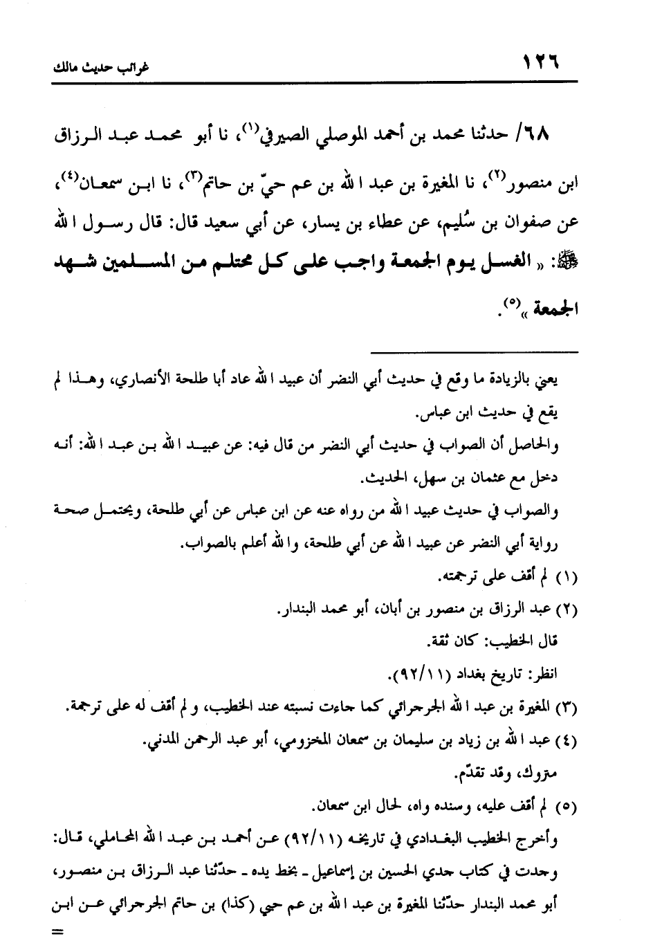 68 - حَدَّثَنَا مُحَمَّدُ بْنُ أَحْمَدَ الموصلي الصيرفي، نا أَبُو مُحَمَّدٍ عَبْدُ الرَّزَّاقِ بْنُ مَنْصُورٍ، نا الْمُغِيرَةُ بْنُ عُبَيْدِ اللَّهِ ابْنُ عَمِّ حَيّ بْنِ حَاتم، نا ابن سمعان عن صَفْوَان بْن سُلَيْمٍ، عَنْ عَطَاءِ بْنِ يَسَارٍ، عَنْ أَبِي سَعِيدٍ، قَالَ: قَالَ رَسُولُ اللَّهِ صَلَّى اللَّهُ عَلَيْهِ وَسَلَّمَ: «الْغُسْلُ يَوْمَ الْجُمُعَةِ وَاجِبٌ عَلَى كُلِّ مُحْتَلِمٍ مِنَ الْمُسْلِمِينَ شَهِدَ الْجُمُعَةَ»