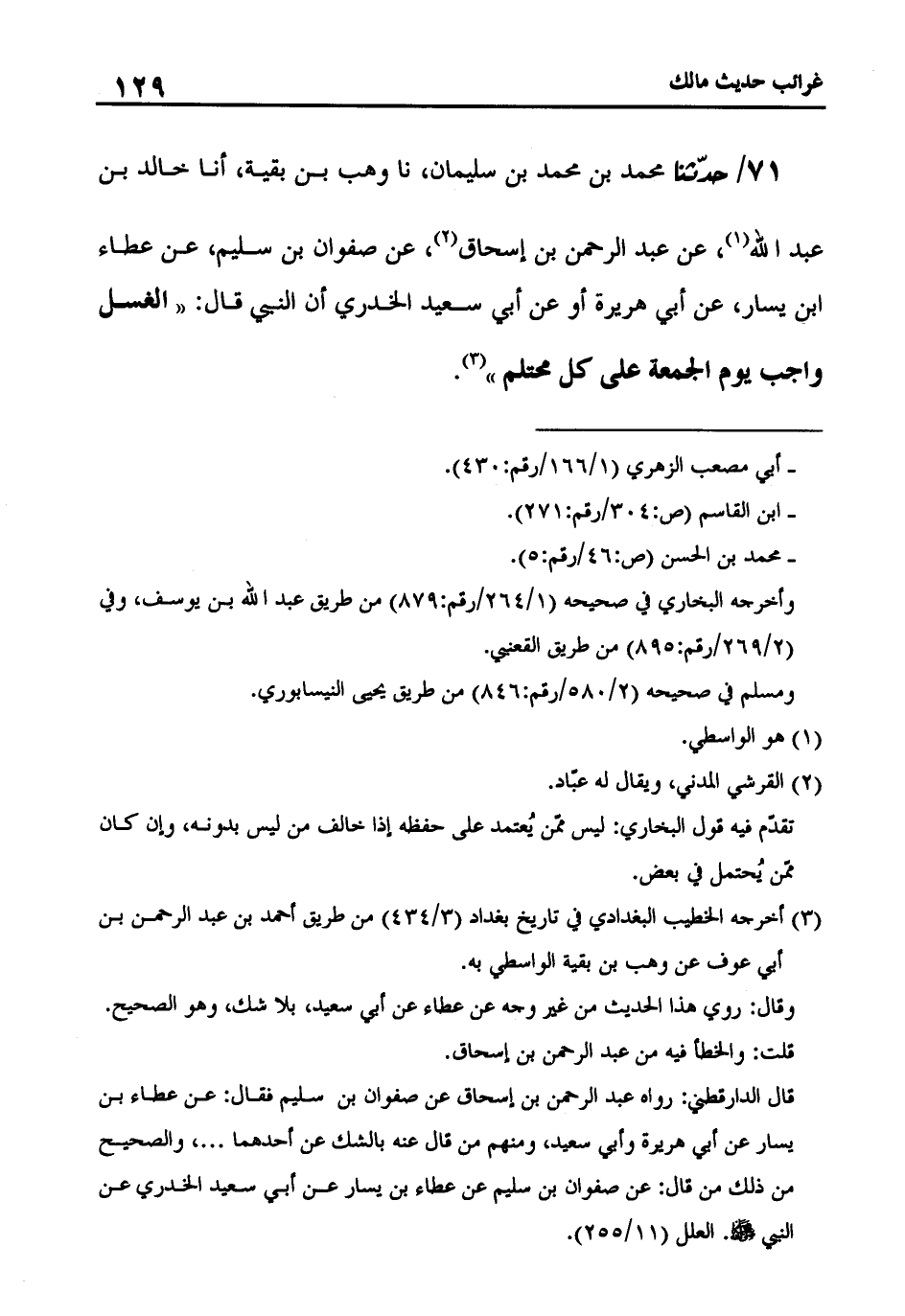 71 - حَدَّثَنَا مُحَمَّدُ بْنُ مُحَمَّدِ بْنِ سُلَيْمَانَ، نا وَهْبُ بْنُ بَقِيَّةَ، أنا خَالِدُ بْنُ عَبْدِ اللَّهِ، عَنْ عَبْدِ الرَّحْمَنِ بْنِ إِسْحَاقَ، عَنْ صَفْوَانَ بْنِ سُلَيْمٍ، عَنْ عَطَاءِ بْنِ يَسَارٍ، عَنْ أَبِي هُرَيْرَةَ، أَوْ عَنْ أَبِي سَعِيدٍ، أَنَّ النَّبِيَّ صَلَّى اللَّهُ عَلَيْهِ وَسَلَّمَ قَالَ: «الْغُسْلُ وَاجِبٌ يَوْمَ الْجُمُعَةِ عَلَى كُلِّ مُحْتَلِمٍ»
