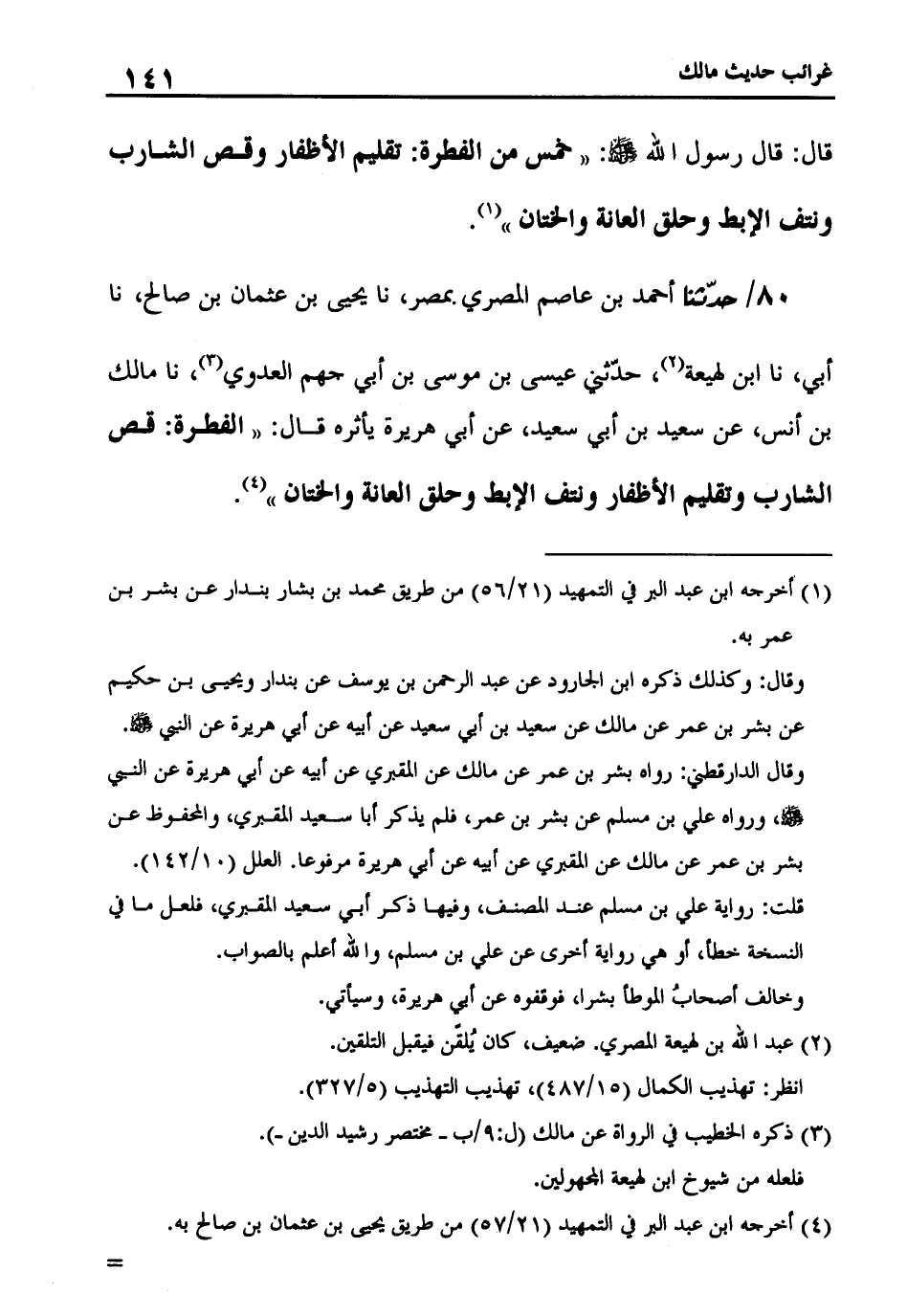 80 - حَدَّثَنَا أَحْمَدُ بْنُ عَاصِمٍ الْمِصْرِيُّ، بِمِصْرَ، نا يَحْيَى بْنُ عُثْمَانَ بْنِ صَالِحٍ، نا أَبِي، نا ابْنُ لَهِيعَةَ، حَدَّثَنِي عِيسَى بْنُ مُوسَى بْنِ أَبِي جَهْمٍ الْعَدَوِيُّ، نا مَالِكُ بْنُ أَنَسٍ، عَنْ سَعِيدٍ بْنِ أَبِي سَعِيدٍ عَنْ أَبِي هُرَيْرَةَ - بِإِثْرِهِ - قَالَ: " الْفِطْرَةُ: قَصُّ الشَّارِبِ، وَتَقْلِيمُ الْأَظْفَارِ، وَنَتْفُ الْإِبْطِ، وَحَلْقُ الْعَانَةِ، وَالْخِتَانُ" -[142]- فِي الْمُوَطَّأِ مَوْقُوفٌ