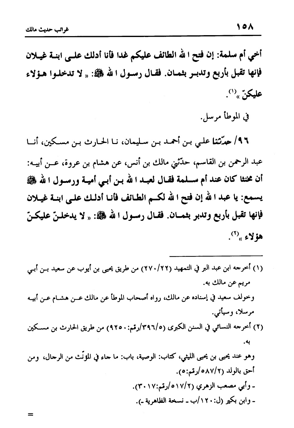 96 - حَدَّثَنَا عَلِيُّ بْنُ أَحْمَدَ بْنِ سُلَيْمَانَ، نا الْحَارِثُ بْنُ مِسْكِينٍ، أنا عَبْدُ الرَّحْمَنِ بْنُ الْقَاسِمِ، حَدَّثَنِي مَالِكُ بْنُ أَنَسٍ، عَنْ هِشَامِ بْنِ عُرْوَةَ، عَنْ أَبِيهِ، أَنَّ مُخَنَّثًا كَانَ عِنْدَ أُمِّ سَلَمَةَ فَقَالَ لِعَبْدِ اللَّهِ بْنِ أَبِي أُمَيَّةَ، وَرَسُولُ اللَّهِ صَلَّى اللَّهُ عَلَيْهِ وَسَلَّمَ يَسْمَعُ: يَا عَبْدَ اللَّهِ إِنْ فَتَحَ اللَّهُ لَكُمُ الطَّائِفَ فَأَنَا أَدُلُّكَ عَلَى ابْنَةِ غَيْلَانَ فَإِنَّهَا تُقْبَلُ بِأَرْبَعٍ وَتُدْبِرُ بِثَمَانٍ، فَقَالَ رَسُولُ اللَّهِ صَلَّى اللَّهُ عَلَيْهِ وَسَلَّمَ: «لَا يَدْخُلَنَّ عَلَيْكُنَّ هَؤُلَاءِ»