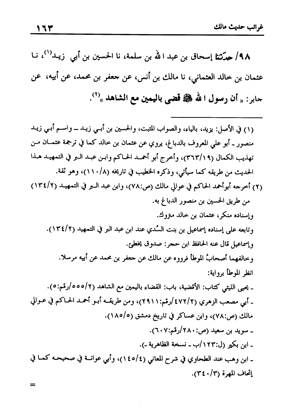 98 - حَدَّثَنِي إِسْحَاقُ بْنُ عَبْدِ اللَّهِ بْنِ سَلَمَةَ، نا الْحُسَيْنُ بْنُ أَبِي يَزِيدَ، نا عُثْمَانُ بْنُ خَالِدٍ الْعُثْمَانِيُّ، نا مَالِكُ بْنُ أَنَسٍ، عَنْ جَعْفَرِ بْنِ مُحَمَّدٍ، عَنْ أَبِيهِ، عَنْ جَابِرٍ، أَنَّ رَسُولَ اللَّهِ صَلَّى اللَّهُ عَلَيْهِ وَسَلَّمَ: «قَضَى بِالْيَمِينِ مَعَ الشَّاهِدِ»