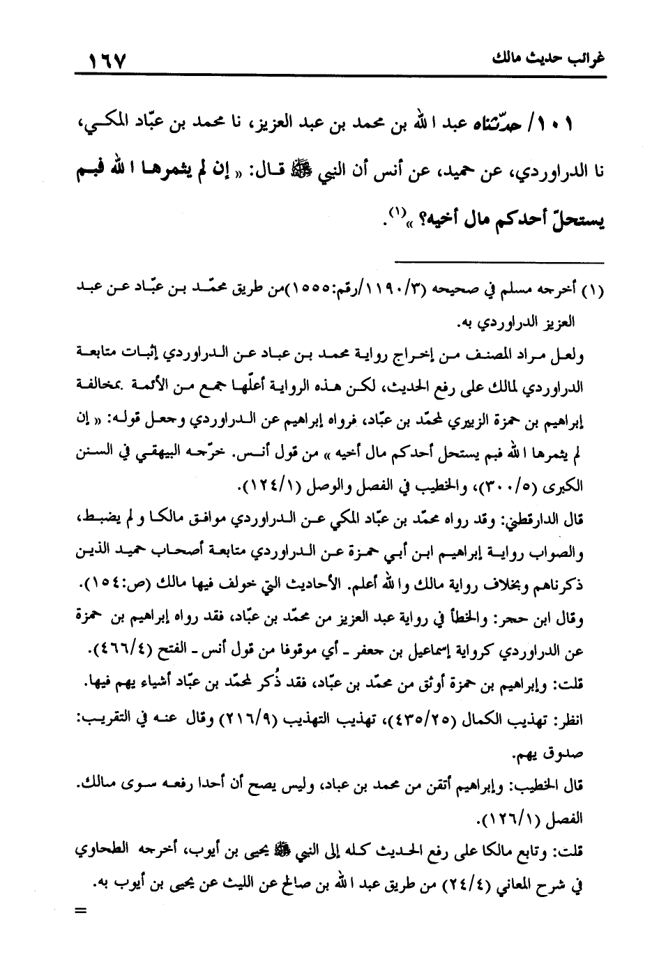 101 - حَدَّثَنَاهُ عَبْدُ اللَّهِ بْنُ مُحَمَّدِ بْنِ عَبْدِ الْعَزِيزِ، نا مُحَمَّدُ بْنُ عَبَّادٍ الْمَكِّيُّ، نا الدَّرَاوَرْدِيُّ، عَنْ حُمَيْدٍ، عَنْ أَنَسٍ، أَنَّ النَّبِيَّ صَلَّى اللَّهُ عَلَيْهِ وَسَلَّمَ قَالَ: «إِنْ لَمْ يُثْمِرْهَا اللَّهُ فَبِمَ يَسْتَحِلُّ أَحَدُكُمْ مَالَ أَخِيهِ»