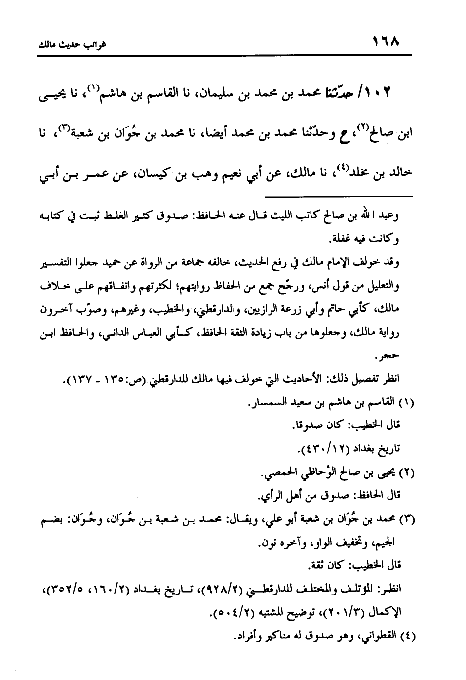102 - حَدَّثَنَا مُحَمَّدُ بْنُ مُحَمَّدِ بْنِ سُلَيْمَانَ، نا الْقَاسِمُ بْنُ هَاشِمٍ، نا يَحْيَى بْنُ صَالِحٍ، ح وَحَدَّثَنَا مُحَمَّدُ بْنُ مُحَمَّدٍ، أَيْضًا، نا مُحَمَّدُ بْنُ حَوَّانَ بْنِ شُعْبَةَ، نا خَالِدُ بْنُ مَخْلَدٍ، عَنْ مَالِكٍ، عَنْ أَبِي نُعَيْمٍ وَهْبِ بْنِ كَيْسَانَ، عَنْ عُمَرَ بْنِ أَبِي -[169]- سَلَمَةَ، قَالَ: قَالَ رَسُولُ اللَّهِ صَلَّى اللَّهُ عَلَيْهِ وَسَلَّمَ: «ادْنُ وَسَمِّ اللَّهَ، وَكُلْ بِيَمِينِكَ، وَكُلْ مِمَّا يَلِيكَ» فِي الْمُوَطَّأِ مُرْسَلٌ