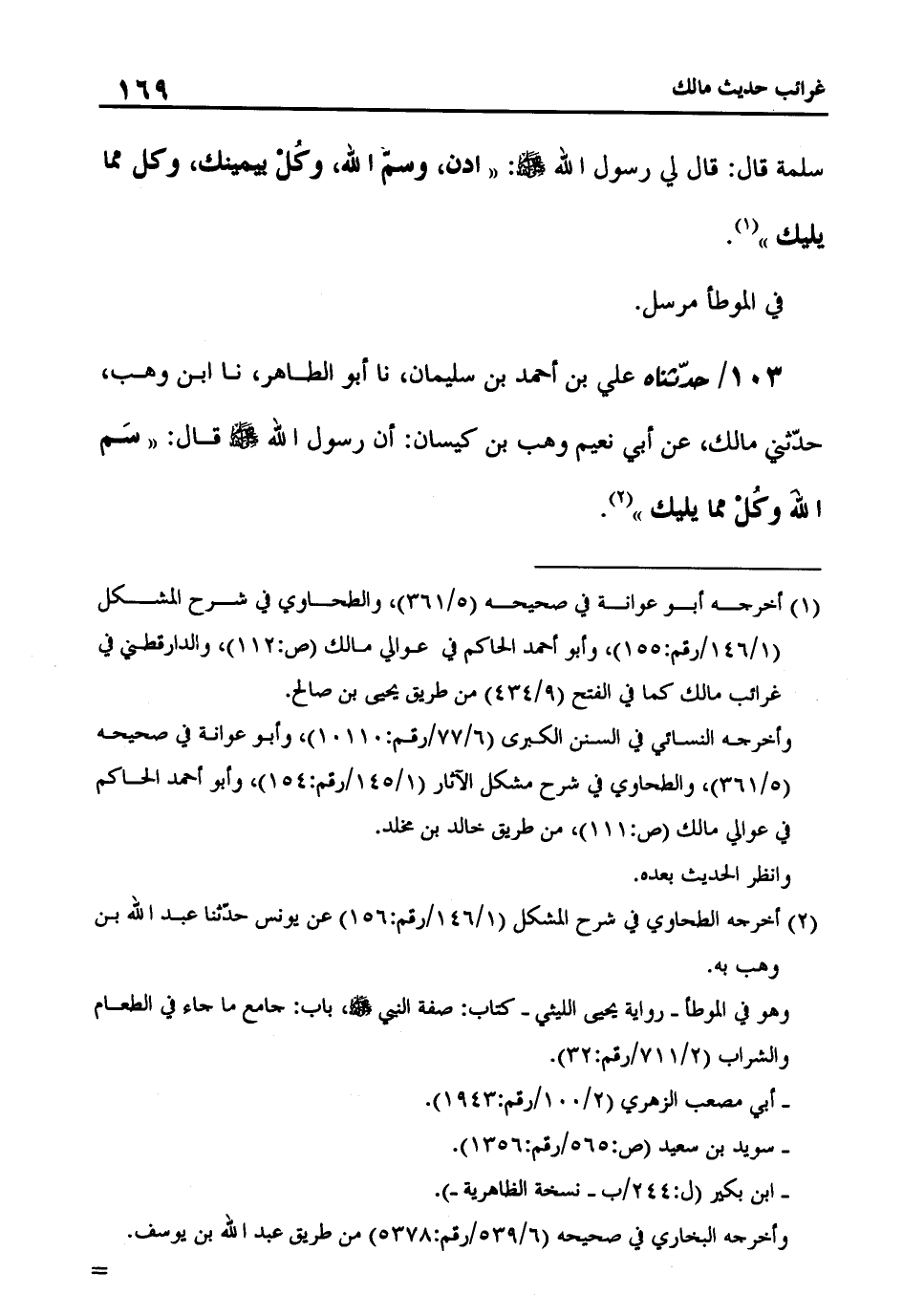 103 - حَدَّثَنَاهُ عَلِيُّ بْنُ أَحْمَدَ بْنِ سُلَيْمَانَ، نا أَبُو الطَاهِرٍ، نا ابْنُ وَهْبٍ، أَخْبَرَنِي مَالِكٌ، عَنْ أَبِي نُعَيْمٍ وَهْبِ بْنِ كَيْسَانَ، أَنَّ رَسُولَ اللَّهِ صَلَّى اللَّهُ عَلَيْهِ وَسَلَّمَ قَالَ: «سَمِّ اللَّهَ وَكُلْ مِمَّا يَلِيكَ»