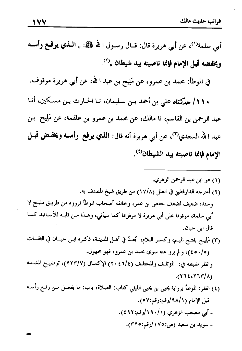 110 - حَدَّثَنَاهُ عَلِيُّ بْنُ أَحْمَدَ بْنِ سُلَيْمَانَ، نا الْحَارِثُ بْنُ مِسْكِينٍ، أنا عَبْدُ الرَّحْمَنِ بْنُ الْقَاسِمِ، نا مَالِكٌ، عَنْ مُحَمَّدِ بْنِ عَمْرٍو بْنِ عَلْقَمَةَ، عَنْ مَلِيحِ بْنِ عَبْدِ اللَّهِ السَّعْدِيِّ، عَنْ أَبِي هُرَيْرَةَ، أَنَّهُ قَالَ: «الَّذِي يَرْفَعُ رَأْسَهُ وَيَخْفِضُ قَبْلَ الْإِمَامِ فَإِنَّمَا نَاصِيَتُهُ بِيَدِ شَيْطَانٍ»