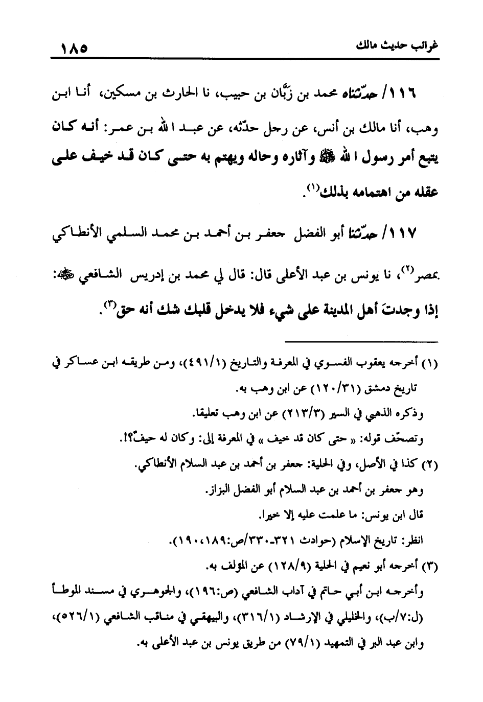 117 - حَدَّثَنَا أَبُو الْفَضْلِ جَعْفَرُ بْنُ أَحْمَدَ بْنِ مُحَمَّدٍ السُّلَمِيُّ الْأَنْطَاكِيُّ بِمِصْرَ، نا يُونُسُ بْنُ عَبْدِ الْأَعْلَى، قَالَ: قَالَ لِي مُحَمَّدُ بْنُ إِدْرِيسَ الشَّافِعِيُّ: «إِذَا وَجَدْتَ أَهْلَ الْمَدِينَةِ عَلَى شَيْءٍ فَلَا يَدْخُلْ قَلْبَكَ شَكٌّ أَنَّهُ حَقٌّ»
