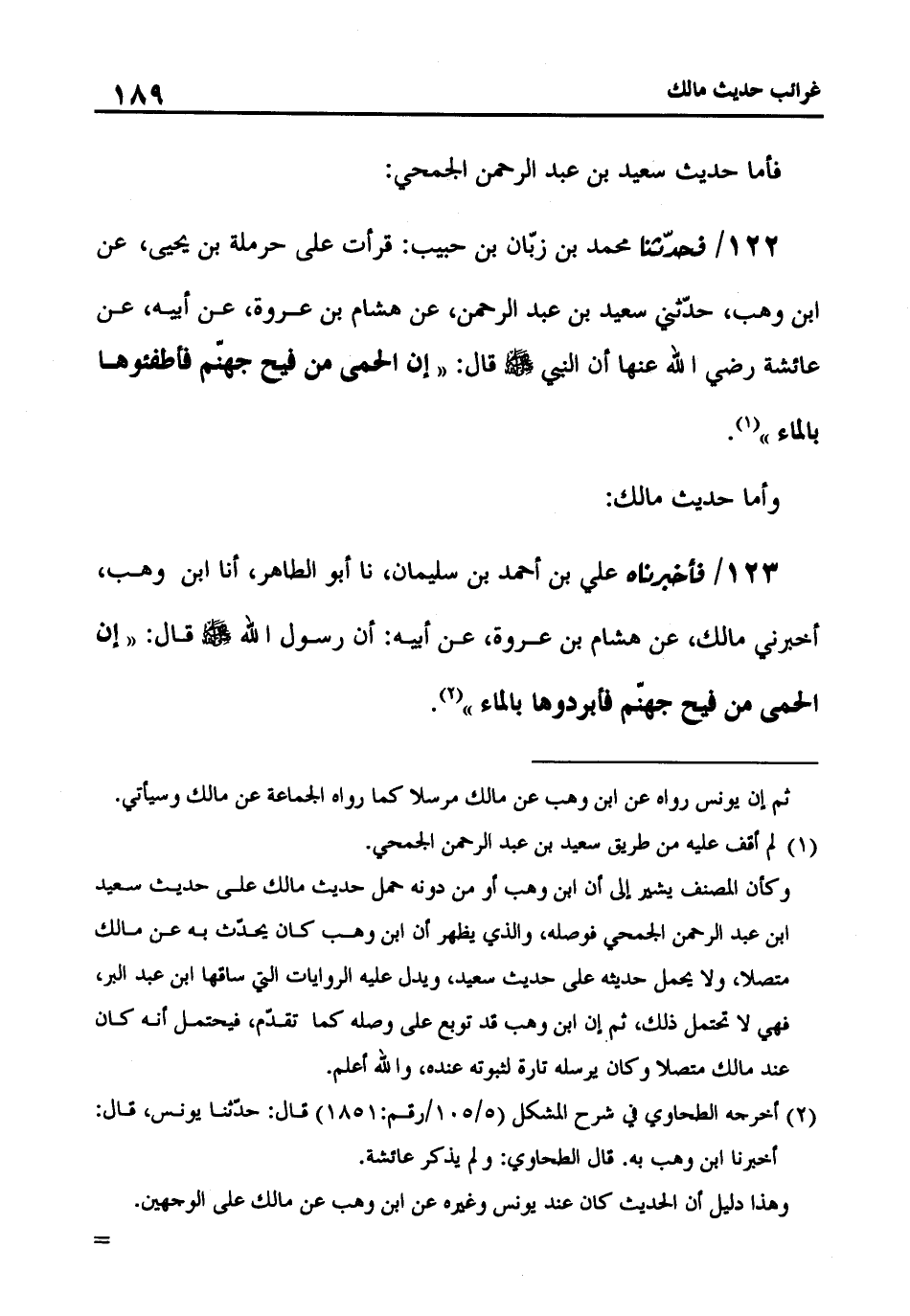 122 - فَحَدَّثَنَا مُحَمَّدُ بْنُ زَيَّانَ بْنِ حَبِيبٍ، قَرَأْتُ عَلَى حَرْمَلَةَ بْنِ يَحْيَى، عَنِ ابْنِ وَهْبٍ، حَدَّثَنِي سَعِيدُ بْنُ عَبْدِ الرَّحْمَنِ، عَنْ هِشَامِ بْنِ عُرْوَةَ، عَنْ أَبِيهِ، عَنْ عَائِشَةَ، رَضِيَ اللَّهُ عَنْهَا: أَنَّ النَّبِيَّ صَلَّى اللَّهُ عَلَيْهِ وَسَلَّمَ قَالَ: «إِنَّ الْحُمَّى مِنْ فَيْحِ جَهَنَّمَ، فَأَطْفِئُوهَا بِالْمَاءِ» وَإِمَّا حَدِيثُ مَالِكٍ