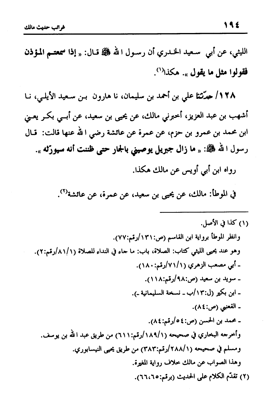 128 - حَدَّثَنَا عَلِيُّ بْنُ أَحْمَدَ بْنِ سُلَيْمَانَ، نا هَارُونُ بْنُ سَعِيدٍ الْأَيْلِيُّ، نا أَشْهَبُ بْنُ عَبْدِ الْعَزِيزِ، أَخْبَرَنِي مَالِكٌ، عَنْ يَحْيَى بْنِ سَعِيدٍ، عَنْ أَبِي بَكْرٍ يَعْنِي ابْنَ مُحَمَّدِ بْنِ عَمْرِو بْنِ حَزْمٍ عَنْ عَمْرَةَ، عَنْ عَائِشَةَ أُمِّ الْمُؤْمِنِينَ، قَالَتْ: قَالَ رَسُولُ اللَّهِ صَلَّى اللَّهُ عَلَيْهِ وَسَلَّمَ: «مَازَالَ جِبْرِيلُ يُوصِينِي بِالْجَارِ حَتَّى ظَنَنْتُ أَنَّهُ سَيُوَرِّثُهُ» رَوَاهُ ابْنُ أَبِي أُوَيْسٍ، عَنْ مَالِكٍ هَكَذَا فِي الْمُوَطَّأِ مَالِكٌ، عَنْ يَحْيَى بْنِ سَعِيدٍ، عَنْ عَمْرَةَ، عَنْ عَائِشَةَ
