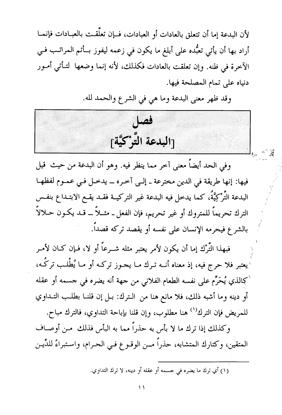 وفي الْحَدِّ أَيْضًا مَعْنًى آخَرُ مِمَّا يُنْظَرُ فِيهِ. وَهُوَ أنَّ الْبِدْعَةَ مِنْ حَيْثُ قِيلَ فِيهَا: إنَّها طَرِيقَةٌ فِي الدِّينِ مُخْتَرَعَةٌ ـ إِلَى آخِرِهِ ـ يَدْخُلُ فِي عُمُومِ لَفْظِهَا الْبِدْعَةُ التَّرْكِيَّةُ، كَمَا يَدْخُلُ فِيهِ الْبِدْعَةُ غَيْرُ التَّرْكِيَّةِ فَقَدْ يَقَعُ الِابْتِدَاعُ بِنَفْسِ التَّرْكِ تَحْرِيمًا لِلْمَتْرُوكِ أَوْ غَيْرَ تحريم، فإنَّ الفعل ـ مثلاً ـ قد يَكُونُ حلَالًا بِالشَّرْعِ فَيُحَرِّمُهُ الْإِنْسَانُ عَلَى نَفْسِهِ أَوْ يَقْصِدُ تَرْكَهُ قَصْدًا.
