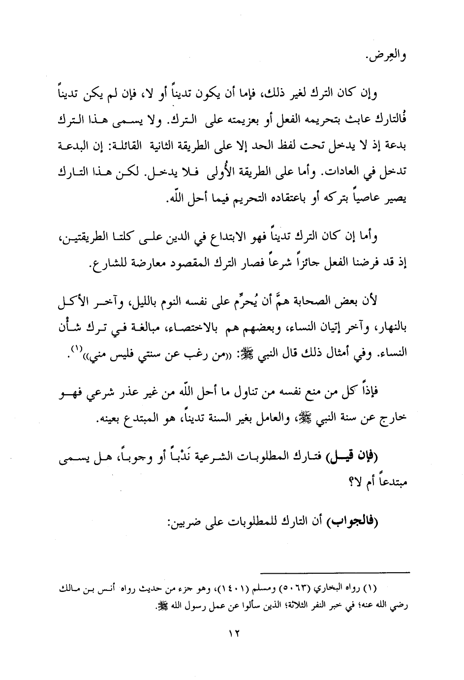 وَإِنْ كَانَ التَّرْكُ لِغَيْرِ ذَلِكَ، فَإِمَّا أَنْ يَكُونَ تَدَيُّنًا أَوْ لَا، فَإِنْ لَمْ يَكُنْ تَدَيُّنًا فَالتَّارِكُ عَابِثٌ بِتَحْرِيمِهِ الْفِعْلَ أَوْ بِعَزِيمَتِهِ عَلَى التَّرْكِ. وَلَا يُسَمَّى هَذَا التَّرْكُ بِدْعَةً إِذْ لَا يَدْخُلُ تَحْتَ لَفْظِ الْحَدِّ إِلَّا عَلَى الطَّرِيقَةِ الثَّانِيَةِ الْقَائِلَةِ: إنَّ الْبِدْعَةَ تَدْخُلُ فِي الْعَادَاتِ. وأمَّا عَلَى الطَّرِيقَةِ الأُولى فلا يدخل. لَكِنَّ هَذَا التَّارِكَ يَصِيرُ عَاصِيًا بِتَرْكِهِ أَوْ بِاعْتِقَادِهِ التَّحْرِيمَ فِيمَا أحلَّ اللَّهُ.