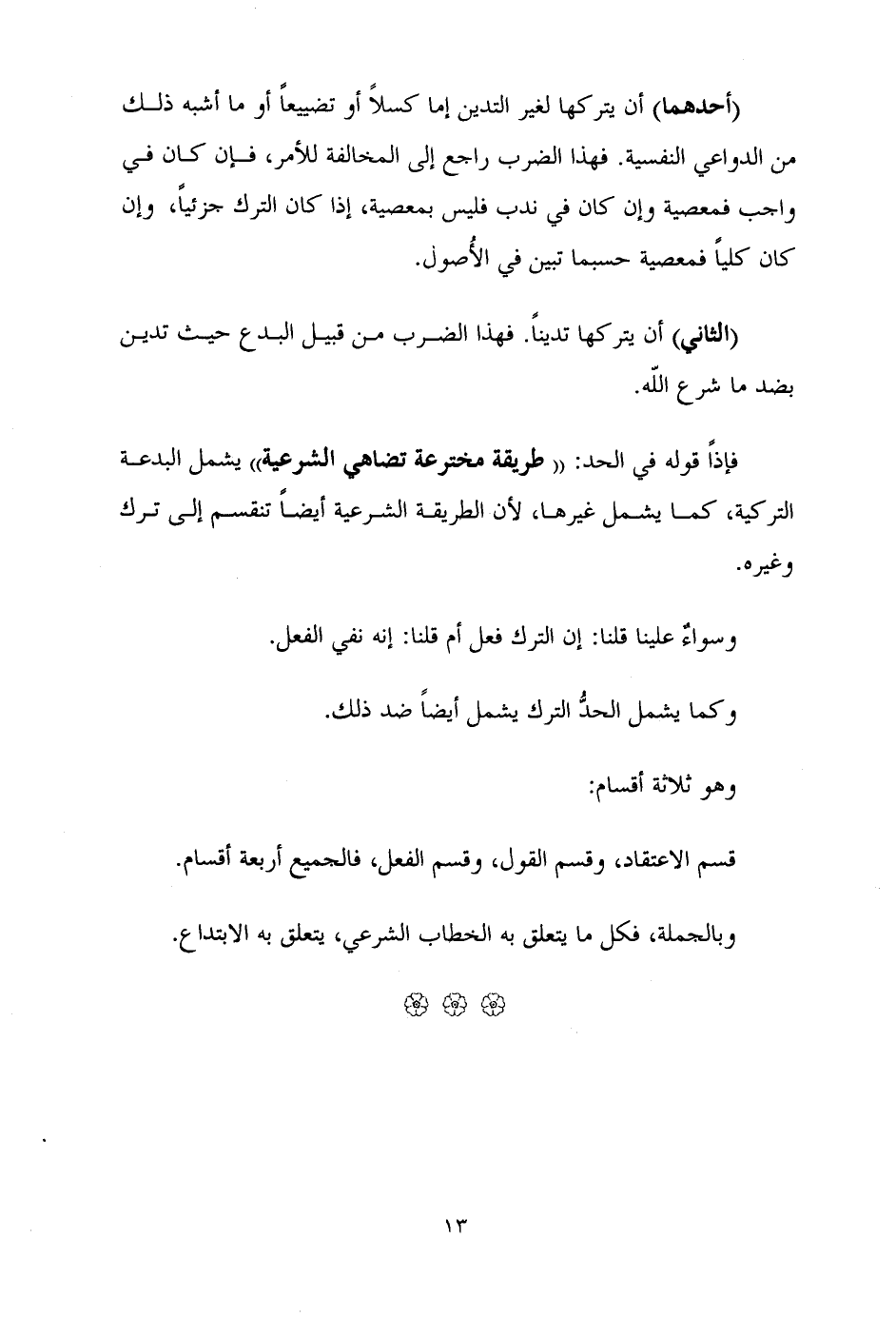 فَإِذًا قَوْلُهُ فِي الْحَدِّ: ((طَرِيقَةٌ مُخْتَرَعَةٌ تُضَاهِي الشَّرْعِيَّةَ)) يَشْمَلُ الْبِدْعَةَ التَّرْكِيَّةَ، كَمَا يَشْمَلُ غَيْرَهَا، لأنَّ الطَّرِيقَةَ الشَّرْعِيَّةَ أَيْضًا تَنْقَسِمُ إِلَى تَرْكٍ وَغَيْرِهِ.