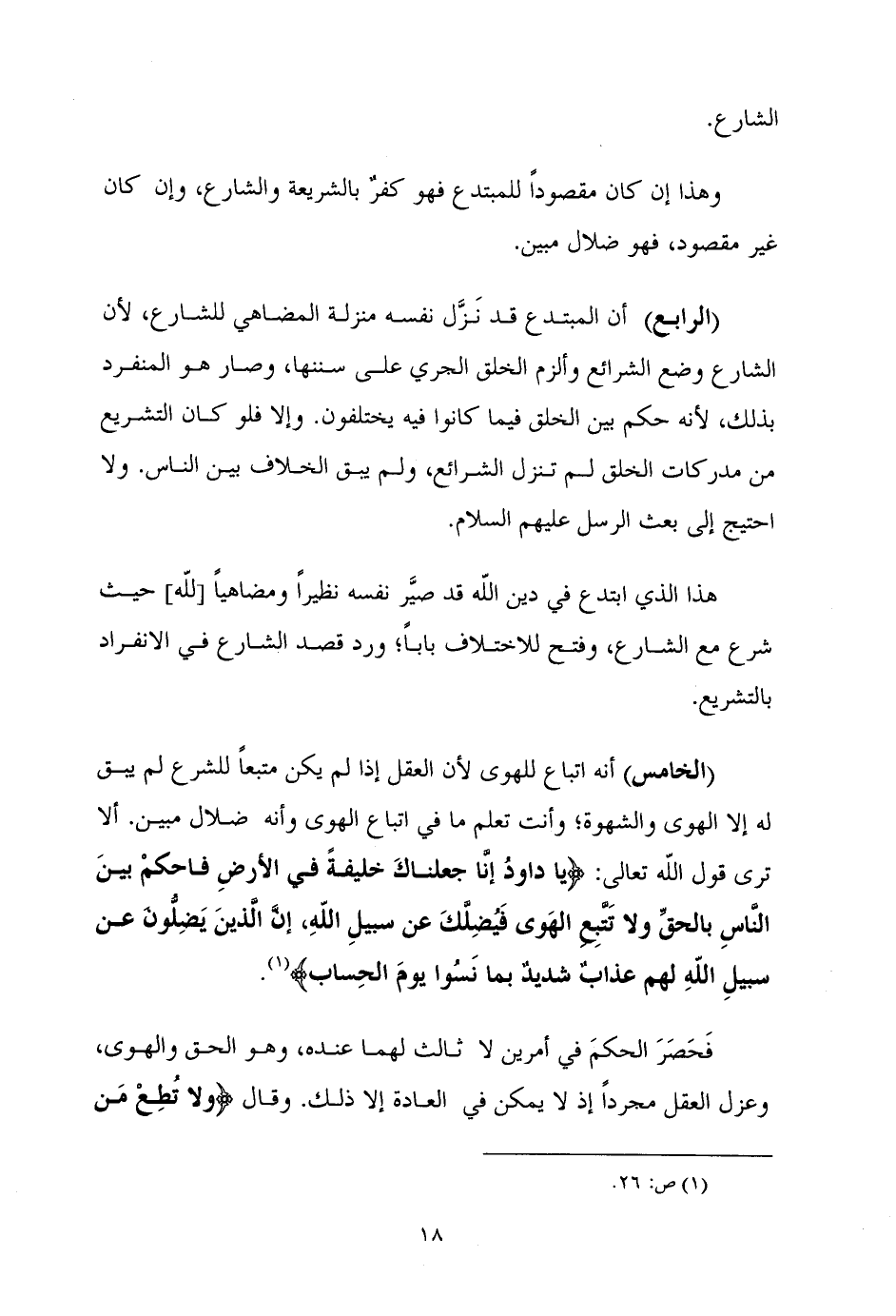 (الرابع) أنَّ الْمُبْتَدِعَ قَدْ نَزَّل نَفْسَهُ مَنْزِلَةَ الْمُضَاهِي لِلشَّارِعِ، لأنَّ الشَّارِعَ وَضَعَ الشَّرَائِعَ وَأَلْزَمَ الْخَلْقَ الْجَرْيَ عَلَى سُنَنِهَا، وَصَارَ هُوَ الْمُنْفَرِدَ بِذَلِكَ، لأنَّه حَكَمَ بَيْنَ الْخَلْقِ فِيمَا كَانُوا فِيهِ يَخْتَلِفُونَ. وَإِلَّا فَلَوْ كَانَ التَّشْرِيعُ مِنْ مُدْرَكَاتِ الْخَلْقِ لَمْ تُنَزَّلِ الشَّرَائِعُ، وَلَمْ يَبْقَ الْخِلَافُ بَيْنَ النَّاسِ. وَلَا احْتِيجَ إِلَى بَعْثِ الرُّسُلِ عليهم السلام.
