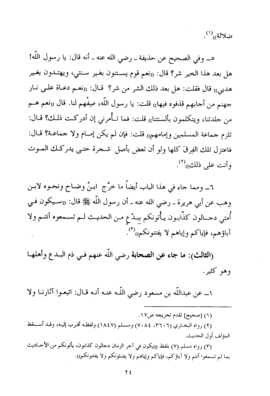 5- وَفِي الصَّحِيحِ عَنْ حُذَيْفَةَ ـ رَضِيَ اللَّهُ عَنْهُ ـ أنَّه قَالَ: يَا رَسُولَ اللَّهِ! هَلْ بَعْدَ هَذَا الْخَيْرِ شَرٌّ؟ قَالَ: ((نَعَمْ قَوْمٌ يَسْتَنُّونَ بِغَيْرِ سُنَّتِي، وَيَهْتَدُونَ بِغَيْرِ هَدْيِي)) قَالَ فَقُلْتُ: هَلْ بَعْدَ ذَلِكَ الشَّرِّ مِنْ شَرٍّ؟ قَالَ: ((نَعَمْ دُعَاةٌ عَلَى نَارِ جَهَنَّمَ مَنْ أَجَابَهُمْ قَذَفُوهُ فِيهَا)) قُلْتُ: يَا رَسُولَ اللَّهِ، صِفْهم لَنَا. قَالَ ((نَعَمْ هُمْ مِنْ جِلْدَتِنَا، وَيَتَكَلَّمُونَ بِأَلْسِنَتِنَا)) قُلْتُ: فَمَا تأْمرني إِنْ أَدْرَكْتُ ذَلِكَ؟ قَالَ: تَلْزَمُ جَمَاعَةَ الْمُسْلِمِينَ وَإِمَامَهُمْ)) قُلْتُ: فَإِنْ لَمْ يَكُنْ إِمَامٌ وَلَا جَمَاعَةٌ؟ قَالَ: فَاعْتَزِلْ تلك الفِرقَ كلها ولو أن تعض بأصل شَجَرَةٍ حَتَّى يُدْرِكَكَ الْمَوْتُ وَأَنْتَ عَلَى ذَلِكَ)) (¬2) .