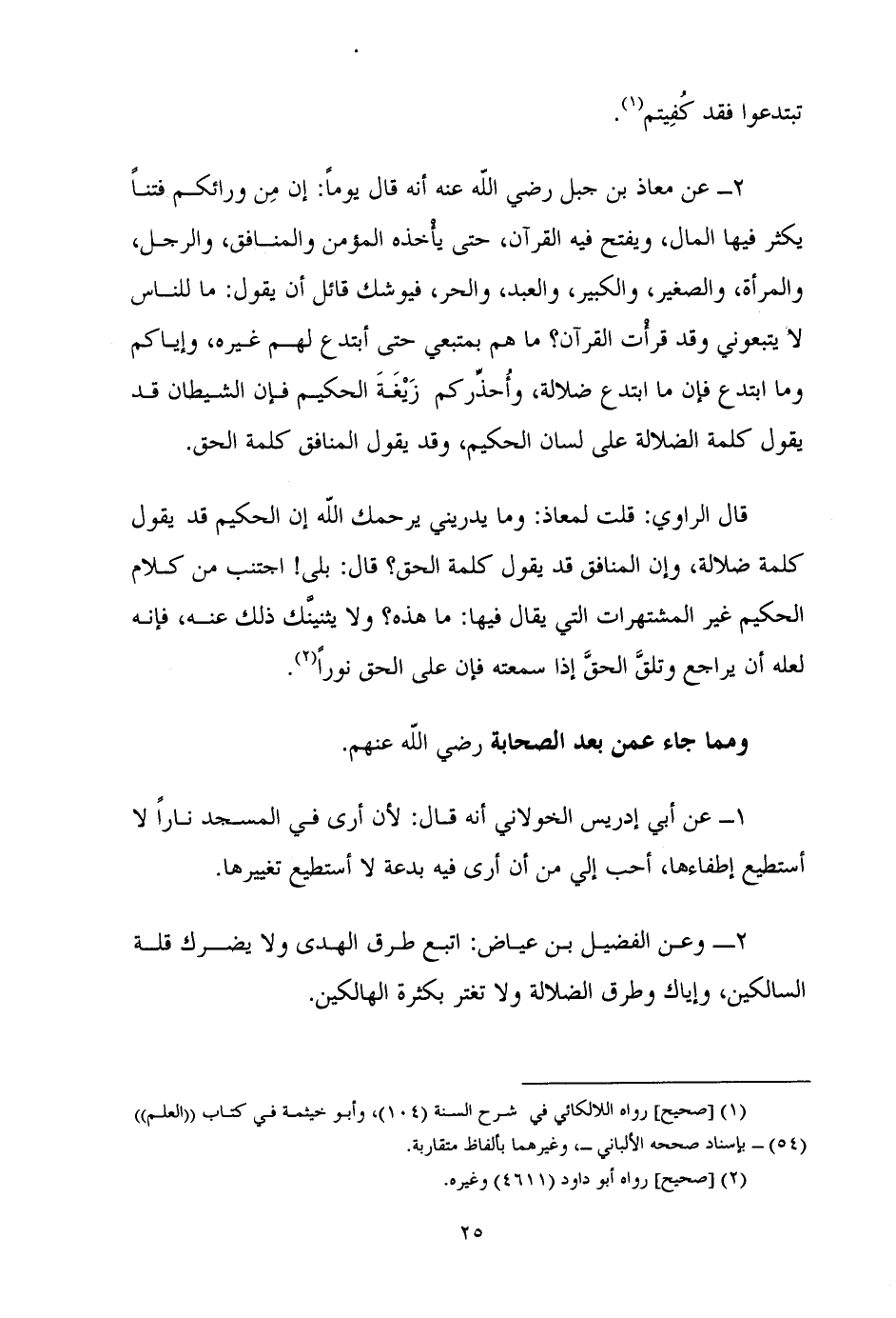 2- عَنْ مُعَاذِ بْنِ جَبَلٍ رَضِيَ اللَّهُ عَنْهُ أنَّه قَالَ يَوْمًا: إنَّ مِن وَرَائِكُمْ فِتَنًا يكثر فيها المال، ويفتح فيه الْقُرْآنُ، حَتَّى يأْخذه الْمُؤْمِنُ وَالْمُنَافِقُ، وَالرَّجُلُ، وَالْمَرْأَةُ، وَالصَّغِيرُ، وَالْكَبِيرُ، وَالْعَبْدُ، وَالْحُرُّ، فَيُوشِكُ قَائِلٌ أَنْ يَقُولَ: مَا لِلنَّاسِ لَا يَتَّبِعُونِي وَقَدْ قرأْت الْقُرْآنَ؟ مَا هُمْ بِمُتَّبِعِيَّ حَتَّى أَبْتَدِعَ لَهُمْ غَيْرَهُ، وَإِيَّاكُمْ وَمَا ابْتُدِعَ فإنَّ مَا ابْتُدِعَ ضَلَالَةٌ، وأُحذِّركم زَيْغَةَ الْحَكِيمِ فإنَّ الشَّيْطَانَ قَدْ يَقُولُ كَلِمَةَ الضَّلَالَةِ عَلَى لِسَانِ الْحَكِيمِ، وَقَدْ يَقُولُ الْمُنَافِقُ كَلِمَةَ الْحَقِّ.