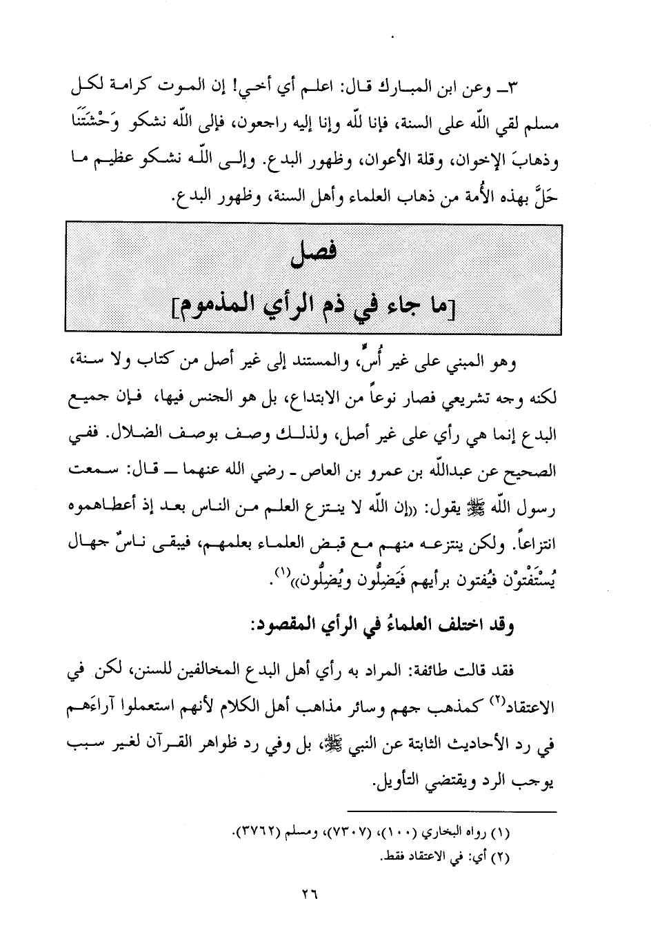 وَهُوَ الْمَبْنِيُّ عَلَى غَيْرِ أُسٍّ، وَالْمُسْتَنِدُ إِلَى غَيْرِ أَصْلٍ مِنْ كِتَابٍ وَلَا سُّنَّةٍ، لَكِنَّهُ وَجْهٌ تَشْرِيعِيٌّ فَصَارَ نَوْعًا مِنَ الِابْتِدَاعِ، بَلْ هُوَ الْجِنْسُ فِيهَا، فإنَّ جَمِيعَ الْبِدَعِ إنَّما هِيَ رَأْيٌ عَلَى غَيْرِ أَصْلٍ، وَلِذَلِكَ وُصِفَ بِوَصْفِ الضَّلَالِ. فَفِي الصَّحِيحِ عَنْ عَبْدِ اللَّهِ بْنِ عَمْرِو بْنِ العاص ـ رَضِيَ اللَّهُ عَنْهُ ـ قَالَ: سَمِعْتُ رَسُولَ اللَّهِ - صَلَّى اللَّهُ عَلَيْهِ وَسَلَّمَ - يَقُولُ: ((إنَّ اللَّهَ لَا يَنْتَزِعُ الْعِلْمَ مِنَ النَّاسِ بَعْدَ إِذْ أَعْطَاهُمُوهُ انْتِزَاعًا. وَلَكِنْ يَنْتَزِعُهُ مِنْهُمْ مَعَ قَبْضِ الْعُلَمَاءِ بِعِلْمِهِمْ، فَيَبْقَى ناسٌ جهالٌ يُسْتَفْتوْن فيُفتون برأيهم فَيَضِلُّون ويُضِلُّون)) (¬1) .