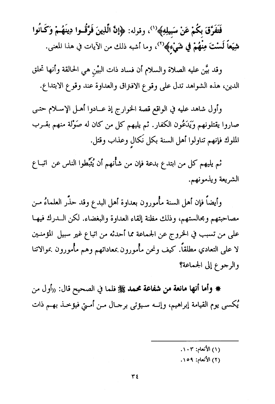 فَتَفَرَّقَ بِكُمْ عَنْ سَبِيلِهِ} (¬1) ، وَقَوْلِهِ: {إنَّ الَّذِينَ فَرَّقُوا دِينَهُمْ وَكَانُوا شِيَعاً لَسْتَ مِنْهُمْ فِي شَيْءٍ} (¬2) ، وَمَا أَشْبَهَ ذَلِكَ مِنَ الْآيَاتِ فِي هَذَا الْمَعْنَى.