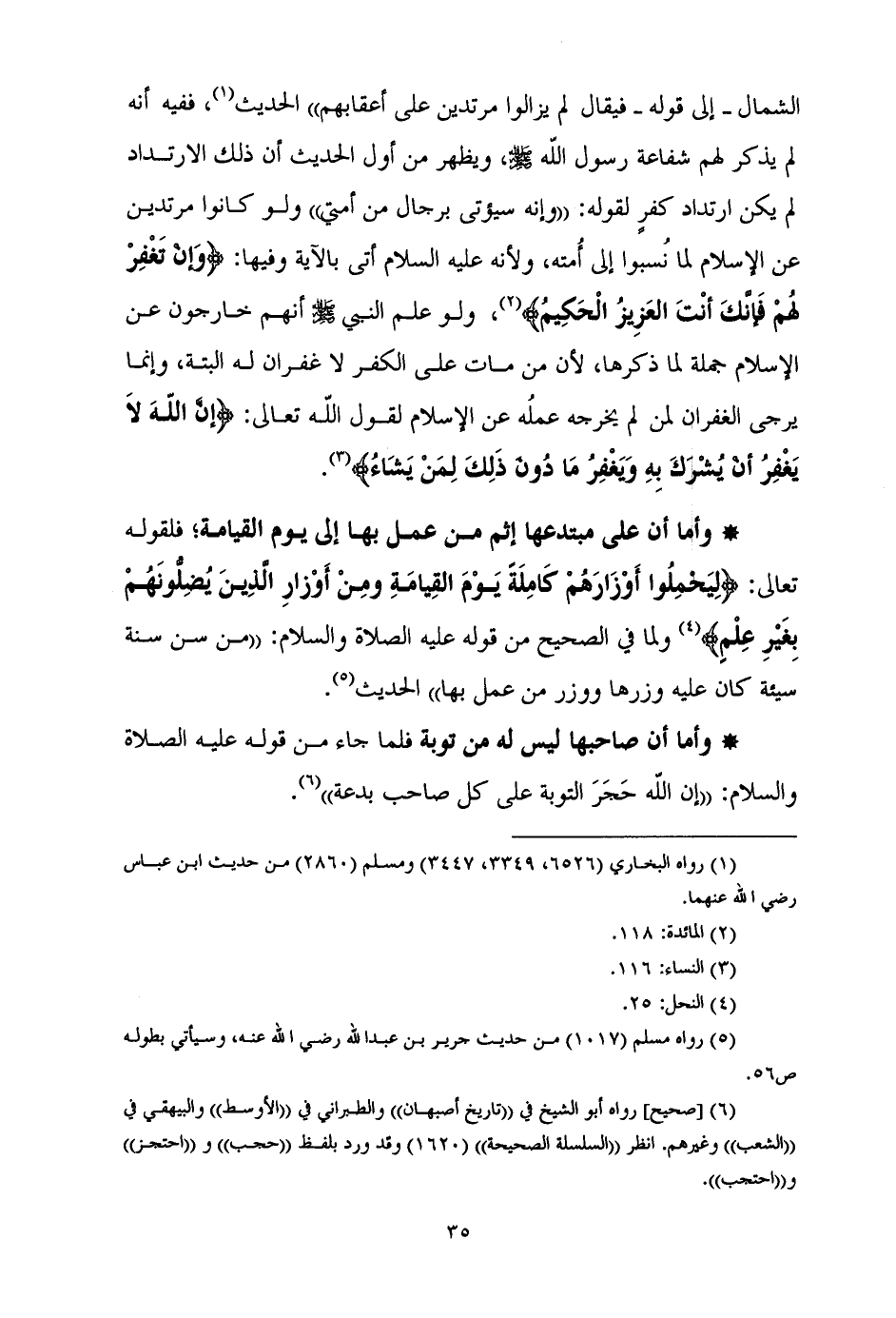 وَيَدُلُّ عَلَى ذَلِكَ أَيْضًا حَدِيثُ الفِرَق إِذْ قَالَ فِيهِ: ((وإنَّه سَيَخْرُجُ فِي أُمتي أَقْوَامٌ تجارى بهم تلك الأهواءُ، كما يتجارى الكَلَبُ (¬7) بِصَاحِبِهِ، لَا يَبْقَى مِنْهُ عِرْقٌ وَلَا مَفْصِلٌ إِلَّا دَخَلَهُ)) (¬8) وَهَذَا النَّفْيُ يَقْتَضِي الْعُمُومَ بِإِطْلَاقٍ، وَلَكِنَّهُ قَدْ يُحْمَلُ عَلَى الْعُمُومِ الْعَادِيِّ، إِذْ لَا يَبْعُدُ أَنْ يَتُوبَ عَمَّا رَأَى وَيَرْجِعَ إِلَى الْحَقِّ، كَمَا نُقِل عَنْ عَبْدِ اللَّهِ بْنِ الْحَسَنِ الْعَنْبَرِيِّ، وَمَا نَقَلُوهُ فِي مُنَاظَرَةِ ابْنِ عَبَّاسٍ الْحَرُورِيَّةَ الْخَارِجِينَ عَلَى عَلِيٍّ رَضِيَ اللَّهُ عَنْهُ، وَفِي مُنَاظَرَةِ عُمَرَ بْنِ عَبْدِ الْعَزِيزِ لِبَعْضِهِمْ. وَلَكِنَّ الْغَالِبَ فِي الْوَاقِعِ الْإِصْرَارُ.