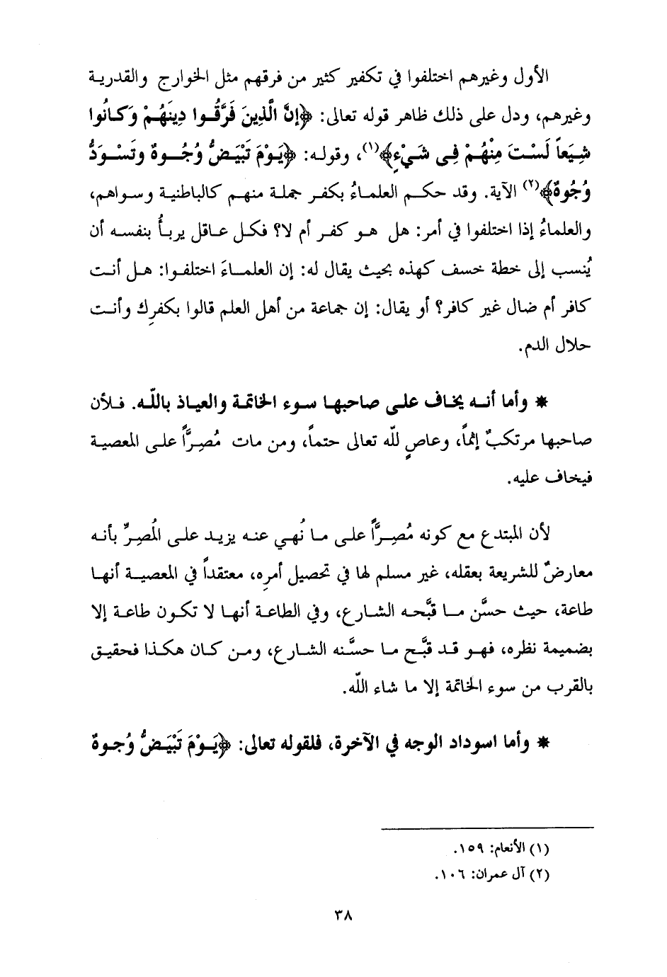 الأوَّل وَغَيْرَهُمُ اخْتَلَفُوا فِي تَكْفِيرِ كَثِيرٍ مِنْ فِرَقِهِمْ مِثْلَ الْخَوَارِجِ وَالْقَدَرِيَّةِ وَغَيْرِهِمْ، وَدَلَّ عَلَى ذَلِكَ ظَاهِرُ قَوْلِهِ تَعَالَى: {إنَّ الَّذِينَ فَرَّقُوا دِينَهُمْ وَكانُوا شِيَعاً لَسْتَ مِنْهُمْ فِى شَيْءٍ} (¬1) ، وَقَوْلِهِ: {يَوْمَ تَبْيَضُّ وُجُوهٌ وتَسْوَدُّ وُجُوهٌ} (¬2) الْآيَةَ. وَقَدْ حَكَمَ العلماءُ بِكُفْرِ جُمْلَةٍ مِنْهُمْ كَالْبَاطِنِيَّةِ وسواهم، والعلماءُ إِذَا اخْتَلَفُوا فِي أَمْرٍ: هَلْ هُوَ كُفْرٌ أَمْ لَا؟ فَكُلُّ عَاقِلٍ يربأُ بِنَفْسِهِ أَنْ يُنسب إِلَى خُطَّةِ خَسْفٍ كَهَذِهِ بِحَيْثُ يُقَالُ لَهُ: إنَّ العلماءَ اخْتَلَفُوا: هَلْ أَنْتَ كَافِرٌ أَمْ ضَالٌّ غَيْرُ كَافِرٍ؟ أَوْ يُقَالُ: إنَّ جَمَاعَةً مِنْ أَهْلِ الْعِلْمِ قَالُوا بكفرِك وَأَنْتَ حَلَالُ الدَّمِ.