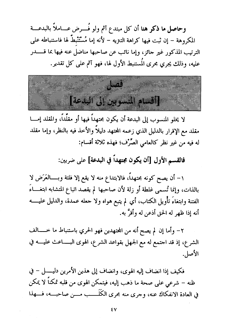 لَا يَخْلُو الْمَنْسُوبُ إِلَى الْبِدْعَةِ أنْ يَكُونَ مُجْتَهِدًا فِيهَا أَوْ مقلِّداً، وَالْمُقَلِّدُ إمَّا مُقَلِّدٌ مَعَ الْإِقْرَارِ بِالدَّلِيلِ الَّذِي زَعَمَهُ الْمُجْتَهِدُ دَلِيلًا وَالْأَخْذُ فِيهِ بِالنَّظَرِ، وإمَّا مُقَلِّدٌ لَهُ فِيهِ مِنْ غَيْرِ نَظَرٍ كَالْعَامِّيِّ الصِّرْف؛ فَهَذِهِ ثَلَاثَةُ أقسام: