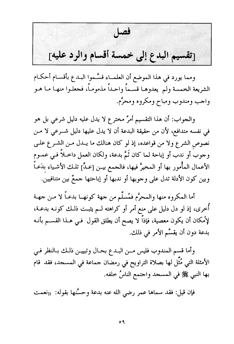 وَالْجَوَابُ: أنَّ هَذَا التَّقْسِيمَ أمرٌ مُخْتَرَعٌ لَا يدل عليه دليل شرعي بل هو في نَفْسُهُ مُتَدَافِعٌ، لأنَّ مِنْ حَقِيقَةِ الْبِدْعَةِ أنْ لَا يَدُلَّ عَلَيْهَا دَلِيلٌ شَرْعِيٌّ لَا مِنْ نصوصِ الشَّرْعِ وَلَا مِنْ قَوَاعِدِهِ، إِذْ لَوْ كَانَ هُنَالِكَ مَا يَدُلُّ مِنَ الشَّرْعِ عَلَى وُجُوبٍ أَوْ نَدْبٍ أَوْ إِبَاحَةٍ لَمَا كَانَ ثَمَّ بِدْعَةٌ، وَلَكَانَ الْعَمَلُ دَاخِلًا فِي عُمُومِ الْأَعْمَالِ المأْمور بِهَا أَوِ المخيرَّ فِيهَا، فَالْجَمْعُ بين [عدِ] تِلْكَ الْأَشْيَاءِ بِدَعاً وَبَيْنَ كَوْنِ الْأَدِلَّةِ تَدُلُّ عَلَى وُجُوبِهَا أَوْ نَدْبِهَا أَوْ إِبَاحَتِهَا جمعٌ بَيْنَ مُتَنَافِيَيْنِ.