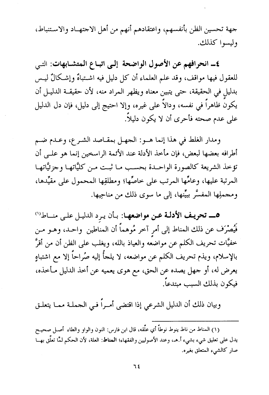 ومدار الغلط في هذا إنَّما هو: الْجَهْلُ بِمَقَاصِدِ الشَّرْعِ، وَعَدَمِ ضَمِّ أَطْرَافِهِ بَعْضِهَا لبعض، فإنَّ مَأْخَذَ الْأَدِلَّةِ عِنْدَ الْأَئِمَّةِ الرَّاسِخِينَ إنَّما هُوَ عَلَى أنْ تُؤْخَذَ الشَّرِيعَةُ كَالصُّورَةِ الْوَاحِدَةِ بِحَسْبِ مَا ثَبَتَ مِنْ كليَّاتها وجزئيَّاتها الْمُرَتَّبَةِ عَلَيْهَا، وعامِّها الْمُرَتَّبِ عَلَى خاصِّها؛ ومطلقِها الْمَحْمُولِ عَلَى مقيِّدِها، ومجملِها المفسَّر ببيِّنها، إِلَى مَا سوى ذلك من مناحِيها.
