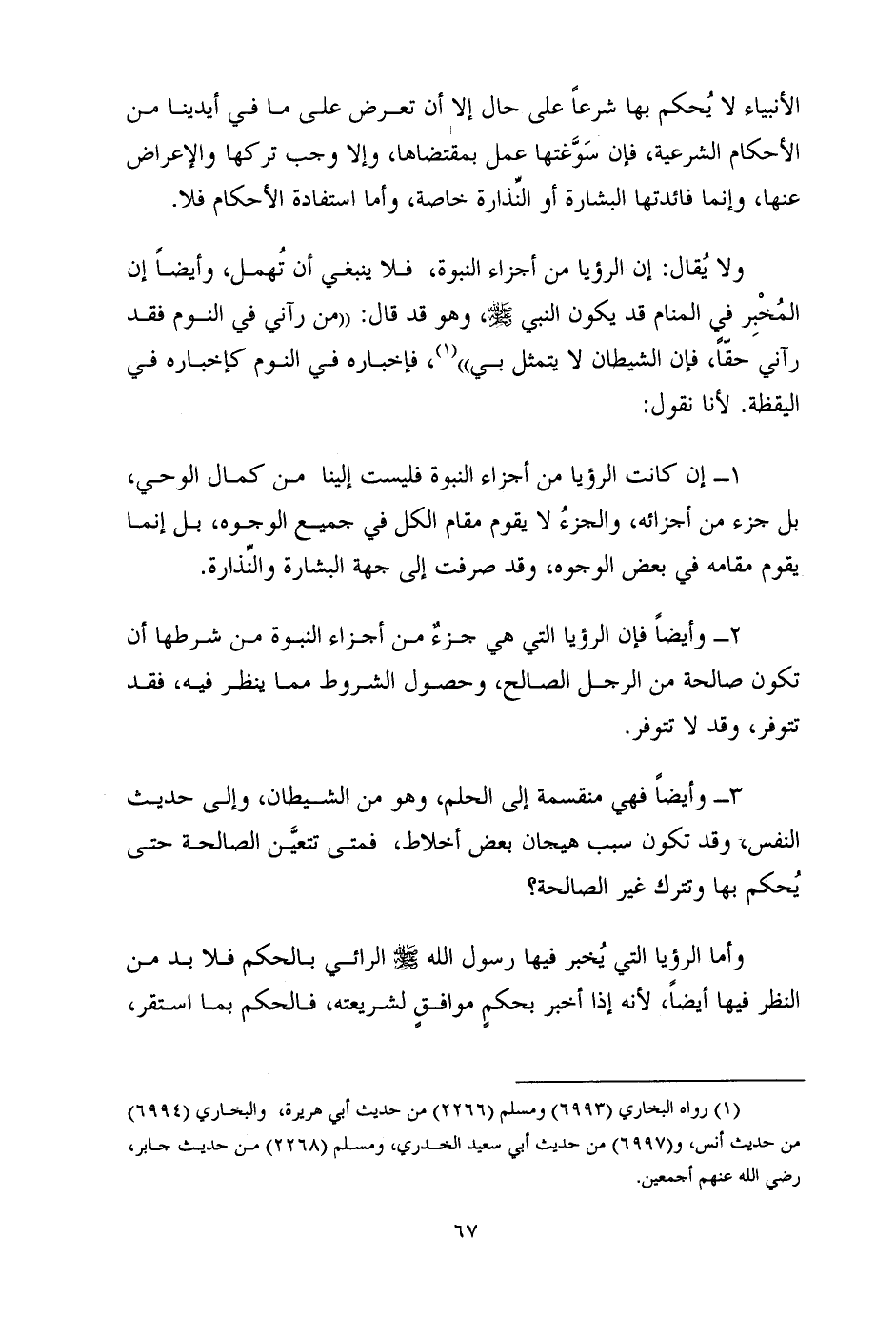 1- إنْ كَانَتِ الرُّؤْيَا مِنْ أَجْزَاءِ النُّبُوَّةِ فَلَيْسَتْ إِلَيْنَا مِنْ كَمَالِ الْوَحْيِ، بَلْ جُزْءٌ مِنْ أَجْزَائِهِ، والجزءُ لَا يَقُومُ مَقَامَ الْكُلِّ فِي جَمِيعِ الْوُجُوهِ، بَلْ إنَّما يَقُومُ مَقَامَهُ فِي بَعْضِ الْوُجُوهِ، وَقَدْ صُرِفَتْ إِلَى جِهَةِ البشارة والنِّذارة.
