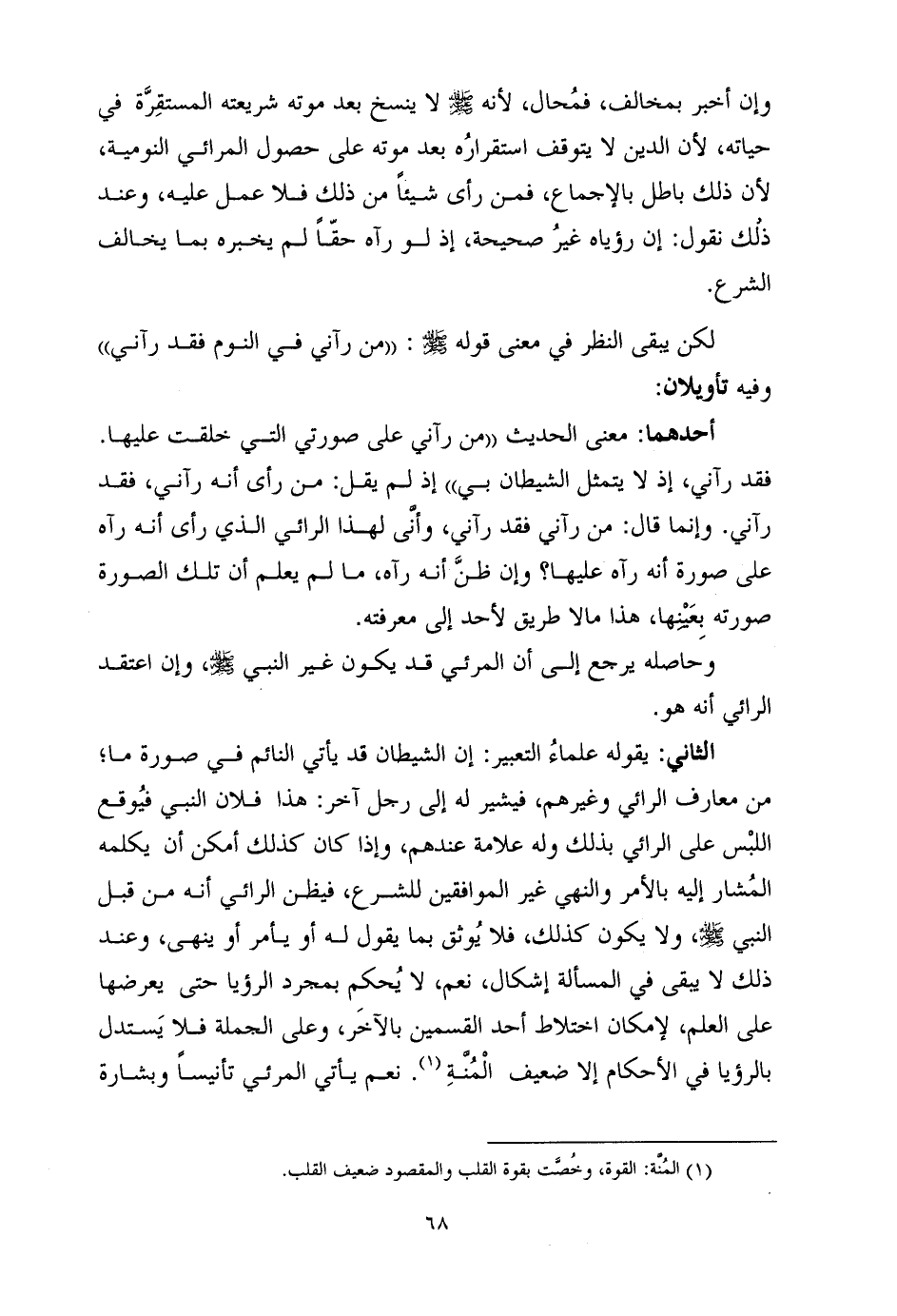 وَحَاصِلُهُ يَرْجِعُ إِلَى أنَّ الْمَرْئِيَّ قَدْ يَكُونُ غَيْرَ النَّبِيِّ - صَلَّى اللَّهُ عَلَيْهِ وَسَلَّمَ -، وَإِنِ اعْتَقَدَ الرَّائِي أَنَّهُ هُوَ.