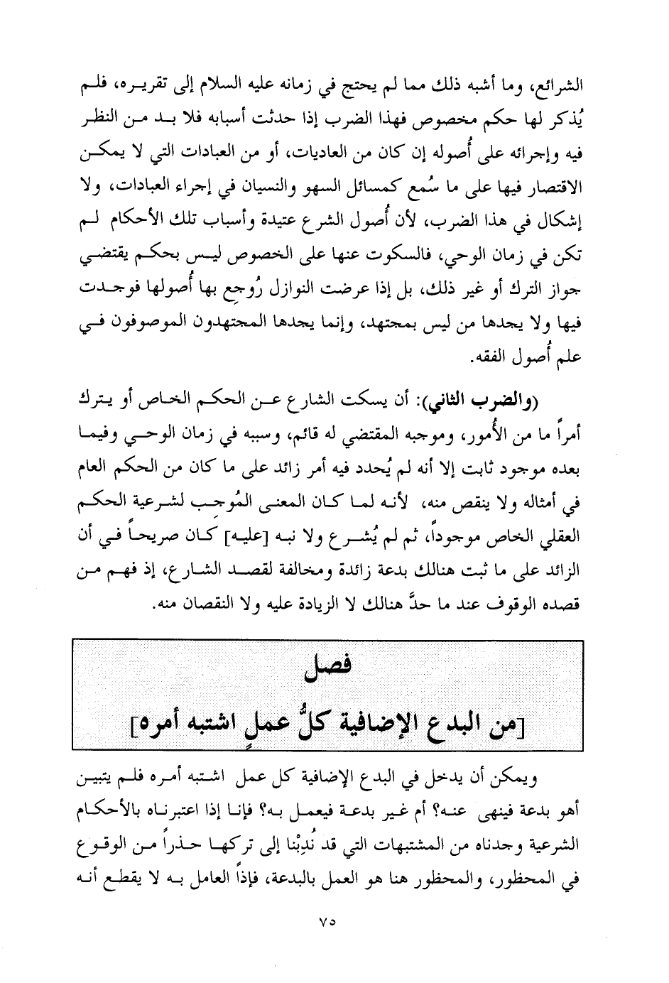 الشَّرَائِعِ، وَمَا أَشْبَهَ ذَلِكَ مِمَّا لَمْ يَحْتَجْ في زمانه عليه السلام إلى تقريره، فَلَمْ يُذكر لَهَا حُكْمٌ مَخْصُوصٌ فَهَذَا الضَّرْبُ إِذَا حَدَثَتْ أَسْبَابُهُ فَلَا بُدَّ مِنَ النَّظَرِ فِيهِ وَإِجْرَائِهِ عَلَى أُصوله إنْ كَانَ مِنَ الْعَادِيَّاتِ، أَوْ مِنَ الْعِبَادَاتِ الَّتِي لَا يُمْكِنُ الِاقْتِصَارُ فِيهَا عَلَى مَا سُمع كَمَسَائِلِ السَّهْوِ والنسيان في إجراء الْعِبَادَاتِ، وَلَا إِشْكَالَ فِي هَذَا الضَّرْبِ، لأنَّ أُصول الشَّرْعِ عَتِيدَةٌ وَأَسْبَابَ تِلْكَ الْأَحْكَامِ لَمْ تَكُنْ فِي زَمَانِ الْوَحْيِ، فَالسُّكُوتُ عَنْهَا عَلَى الْخُصُوصِ لَيْسَ بِحُكْمٍ يَقْتَضِي جَوَازَ التَّرْكِ أَوْ غَيْرَ ذَلِكَ، بَلْ إِذَا عُرِضَتِ النَّوَازِلُ رُوجِع بِهَا أُصولها فَوُجِدَتْ فِيهَا وَلَا يَجِدُهَا مَنْ لَيْسَ بِمُجْتَهِدٍ، وإنَّما يَجِدُهَا الْمُجْتَهِدُونَ الْمَوْصُوفُونَ فِي عِلْمِ أُصول الْفِقْهِ.