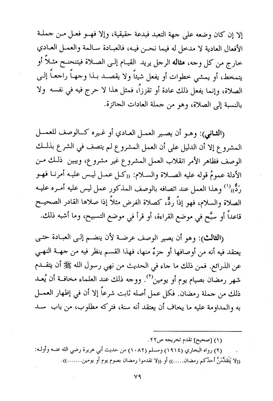 (الثَّالِثُ) : وَهُوَ أنْ يَصِيرَ الْوَصْفُ عُرْضَةً لأنْ يَنْضَمَّ إِلَى الْعِبَادَةِ حَتَّى يُعْتَقَدَ فِيهِ أَنَّهُ مِنْ أَوْصَافِهَا أَوْ جزءٌ مِنْهَا، فَهَذَا الْقِسْمُ يُنْظَرُ فِيهِ مِنْ جِهَةِ النَّهْيِ عَنِ الذَّرَائِعِ. فمن ذلك ما جاء في الحديث مِنْ نَهْيِ رَسُولِ اللَّهِ - صَلَّى اللَّهُ عَلَيْهِ وَسَلَّمَ - أنْ يُتَقَدَّمَ شَهْرُ رَمَضَانَ بِصِيَامِ يَوْمٍ أو يومين (¬2) . ووجه ذَلِكَ عِنْدَ الْعُلَمَاءِ مَخَافَةَ أنْ يُعد ذَلِكَ من جملة رمضان. فَكُلُّ عَمَلٍ أَصْلُهُ ثَابِتٌ شَرْعًا إِلَّا أنَّ فِي إِظْهَارِ الْعَمَلِ بِهِ وَالْمُدَاوَمَةِ عَلَيْهِ مَا يُخَافُ أنْ يُعْتَقَدَ أَنَّهُ سُنَّةٌ، فَتَرْكُهُ مَطْلُوبٌ، من باب سد