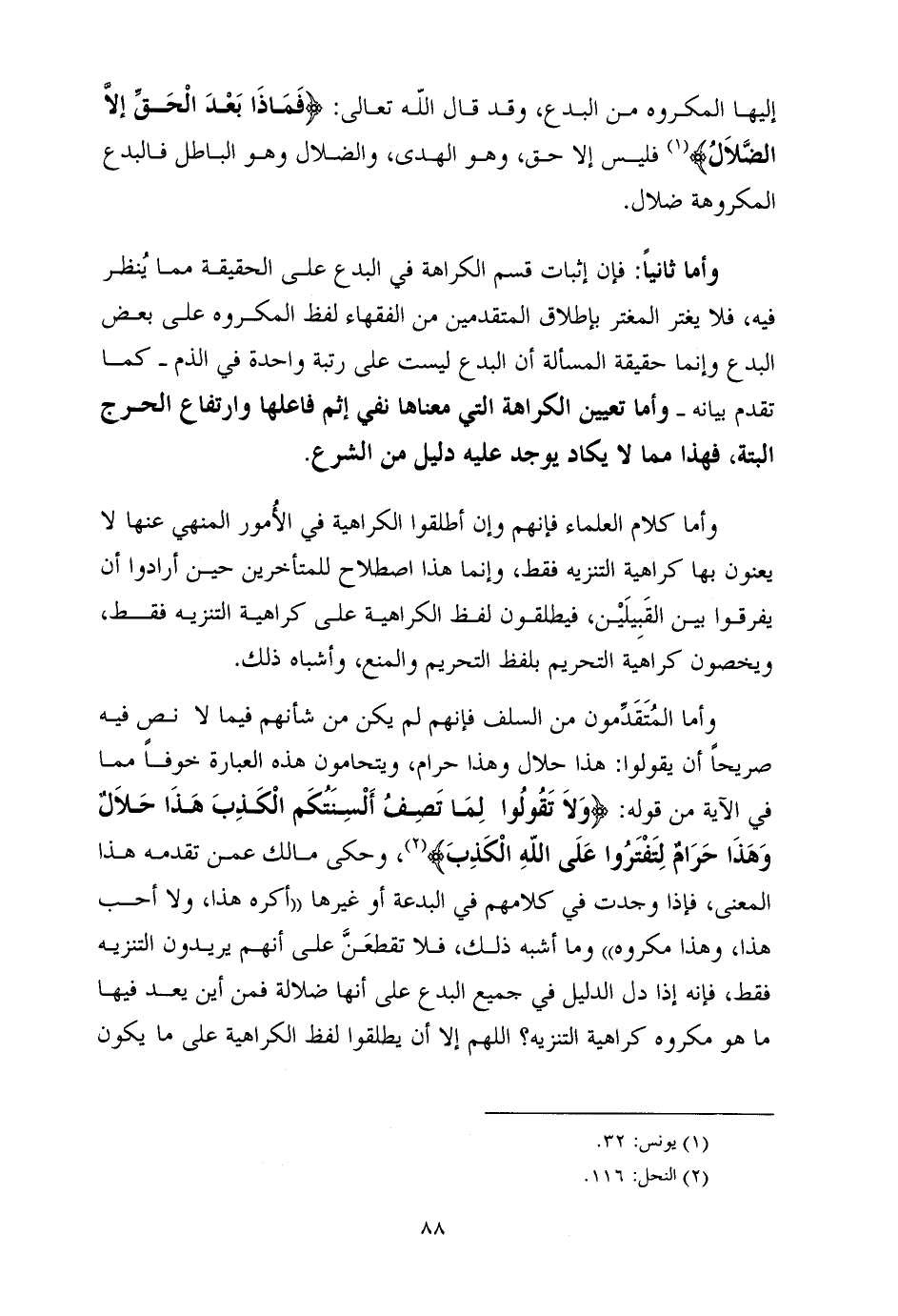 وأمَّا ثَانِيًا: فإنَّ إِثْبَاتَ قَسْمِ الْكَرَاهَةِ فِي الْبِدَعِ عَلَى الْحَقِيقَةِ مِمَّا يُنظر فِيهِ، فَلَا يَغْتَرُّ الْمُغْتَرُّ بِإِطْلَاقِ الْمُتَقَدِّمِينَ مِنَ الْفُقَهَاءِ لَفْظُ الْمَكْرُوهِ عَلَى بَعْضِ الْبِدَعِ وإنَّما حَقِيقَةُ الْمَسْأَلَةِ أنَّ الْبِدَعَ لَيْسَتْ عَلَى رُتْبَةٍ وَاحِدَةٍ فِي الذَّمِّ - كَمَا تَقَدَّمَ بَيَانُهُ - وأمَّا تَعْيِينُ الْكَرَاهَةِ الَّتِي مَعْنَاهَا نَفْيُ إِثْمِ فَاعِلِهَا وَارْتِفَاعُ الْحَرَجِ ألبتَّة، فَهَذَا مِمَّا لَا يَكَادُ يُوجَدُ عَلَيْهِ دَلِيلٌ مِنَ الشرع.