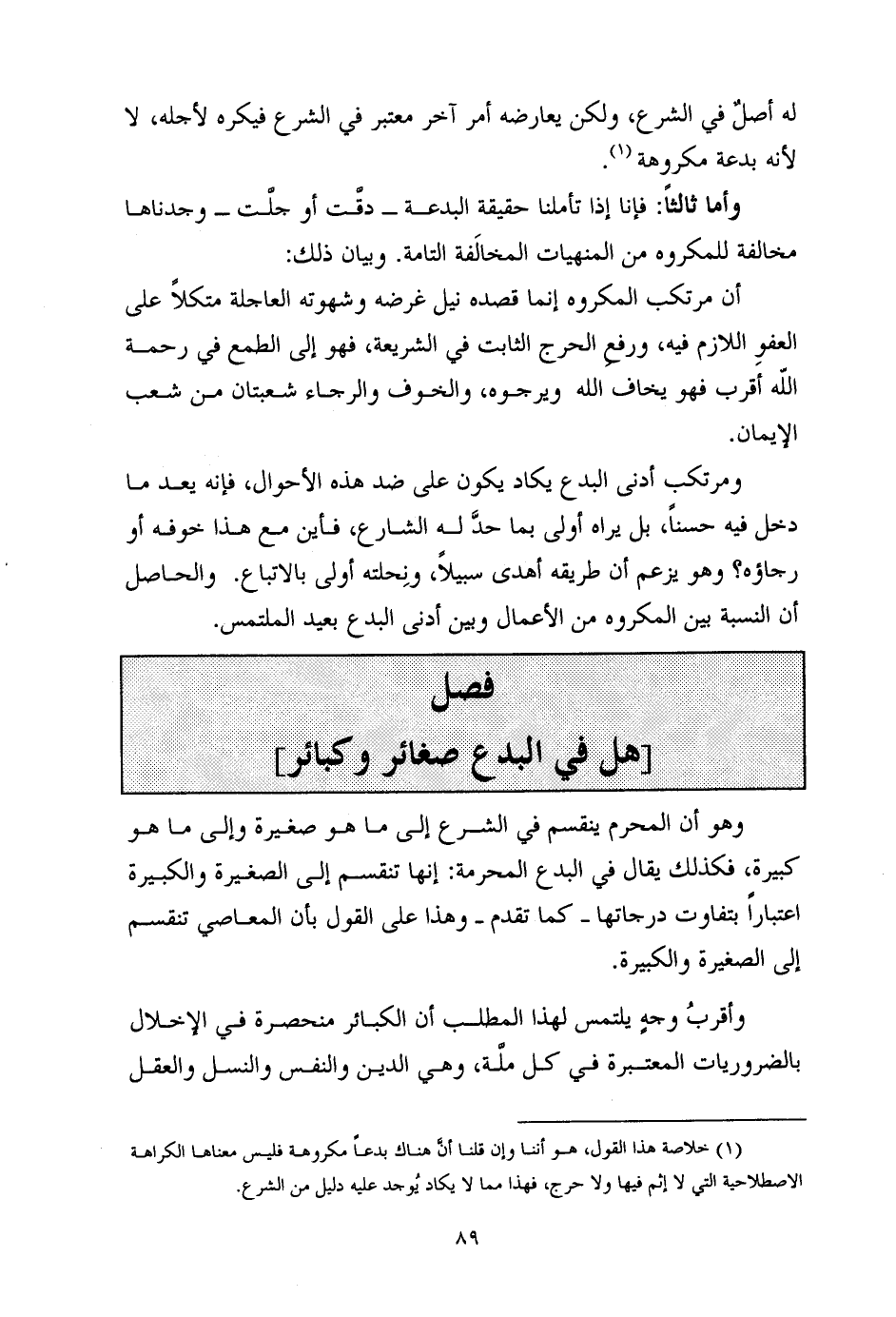 وَهُوَ أنَّ الْمُحْرِمَ يَنْقَسِمُ فِي الشَّرْعِ إِلَى مَا هُوَ صَغِيرَةٌ وَإِلَى مَا هُوَ كَبِيرَةٌ، فَكَذَلِكَ يُقَالُ فِي الْبِدَعِ الْمُحَرَّمَةِ: إنَّها تَنْقَسِمُ إِلَى الصَّغِيرَةِ وَالْكَبِيرَةِ اعْتِبَارًا بِتَفَاوُتِ دَرَجَاتِهَا - كَمَا تَقَدَّمَ - وَهَذَا عَلَى الْقَوْلِ بأنَّ الْمَعَاصِيَ تَنْقَسِمُ إلى الصغيرة والكبيرة.