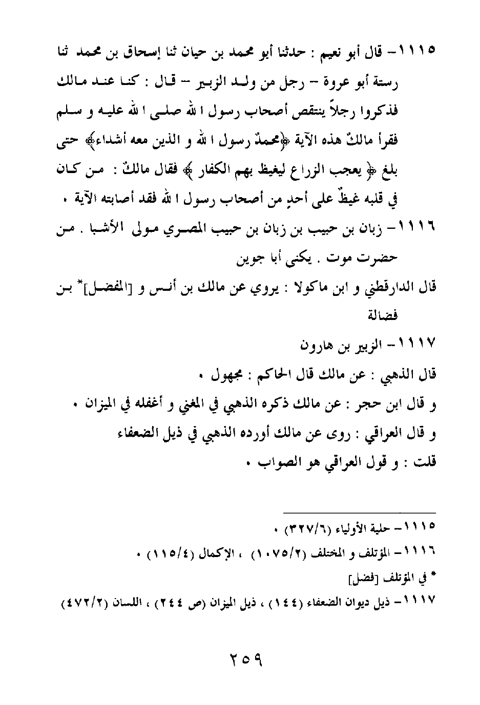 1115- قال أبو نعيم: حدثنا أبو محمد بن حيان، ثنا إسحاق بن محمد، ثنا رستة أبو عروة -رجل من ولد الزبير- قال: كنا عند مالك فذكروا رجلاً ينتقص أصحاب رسول الله صلى الله عليه وسلم فقرأ مالكٌ هذه الآية {محمدٌ رسول الله والذين معه أشداء} حتى بلغ {يعجب الزراع ليغيظ بهم الكفار} فقال مالكٌ: من كان في قلبه غيظٌ على أحدٍ من أصحاب رسول الله فقد أصابته الآية.