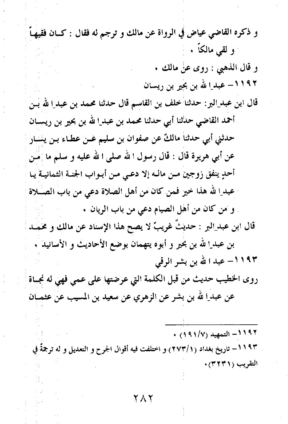 قال ابن عبد البر: حدثنا خلف بن القاسم قال: حدثنا محمد بن عبد الله بن أحمد القاضي، حدثنا أبي، حدثنا محمد بن عبد الله بن بحير بن ريسان، حدثني أبي، حدثنا مالكٌ عن صفوان بن سليم، عن عطاء بن يسار، عن أبي هريرة قال: قال رسول الله صلى الله عليه وسلم: ما من أحدٍ ينفق زوجين من ماله إلا دعي من أبواب الجنة الثمانية يا عبد الله هذا خير فمن كان من أهل الصلاة دعي من باب الصلاة، ومن كان من أهل الصيام دعي من باب الريان.