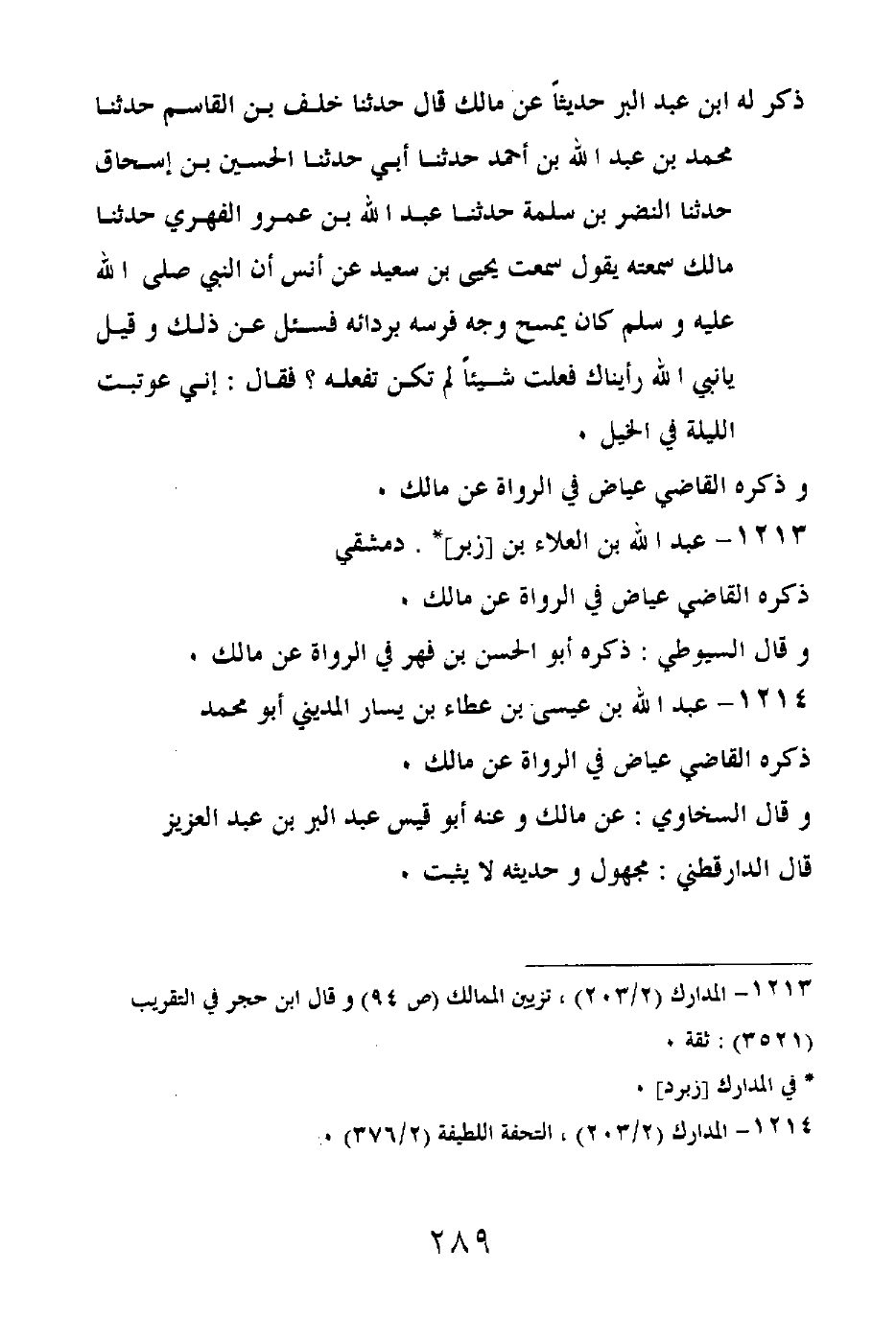ذكر له ابن عبد البر حديثاً، عن مالك قال: حدثنا خلف بن القاسم، حدثنا محمد بن عبد الله بن أحمد، حدثنا أبي، حدثنا الحسين بن إسحاق، حدثنا النضر بن سلمة، حدثنا عبد الله بن عمرو الفهري، حدثا مالك سمعته يقول، سمعت يحيى بن سعيد عن أنس أن النبي صلى الله عليه وسلم كان يمسح وجه فرسه بردائه فسئل عن ذلك وقيل: يا نبي الله رأيناك فعلت شيئاً لم تكن تفعله؟ فقال: إني عوتبت الليلة في الخيل.