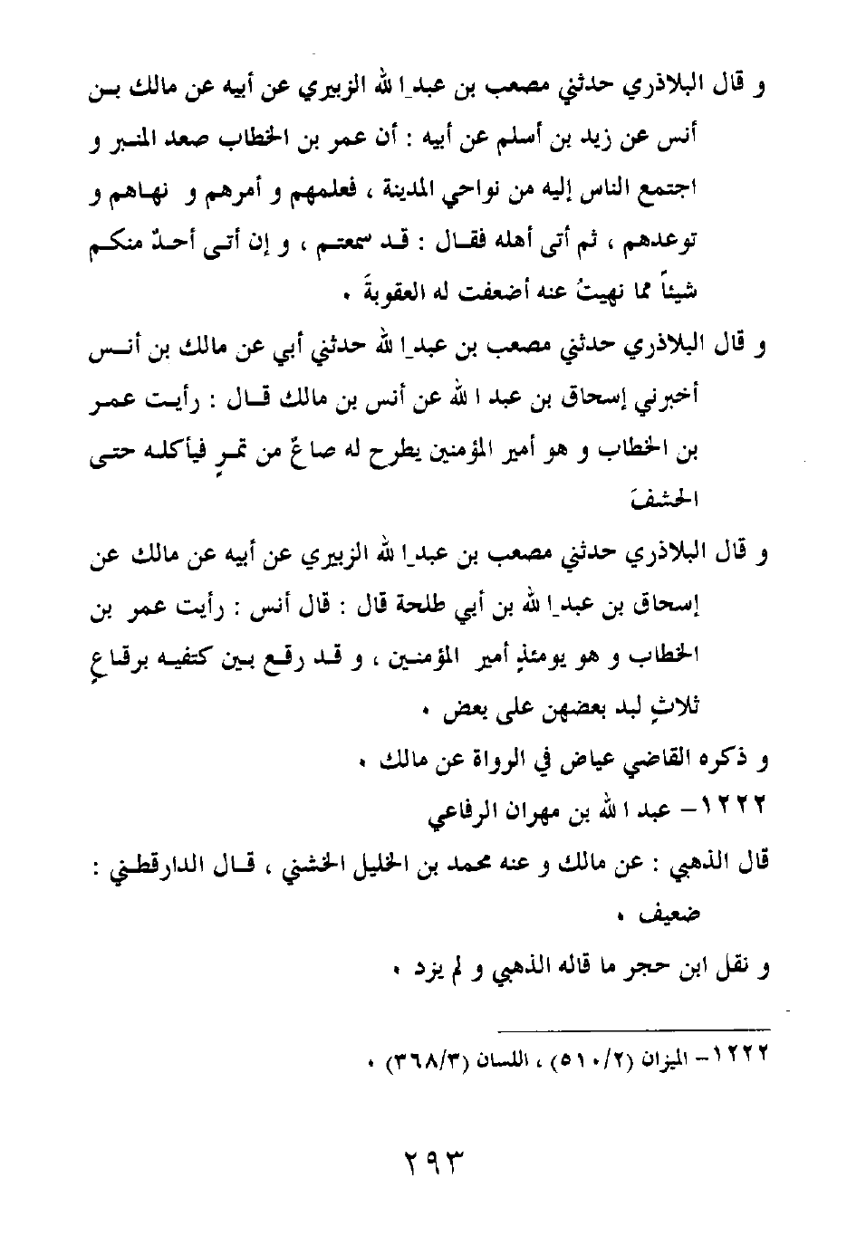 وقال البلاذري: حدثني مصعب بن عبد الله الزبيري، عن أبيه، عن مالك، عن إسحاق بن عبد الله بن أبي طلحة قال: قال أنس: رأيت عمر بن الخطاب وهو يومئذٍ أمير المؤمنين، وقد رقع بين كتفيه برقاعٍ ثلاثٍ لبد بعضهن على بعض.